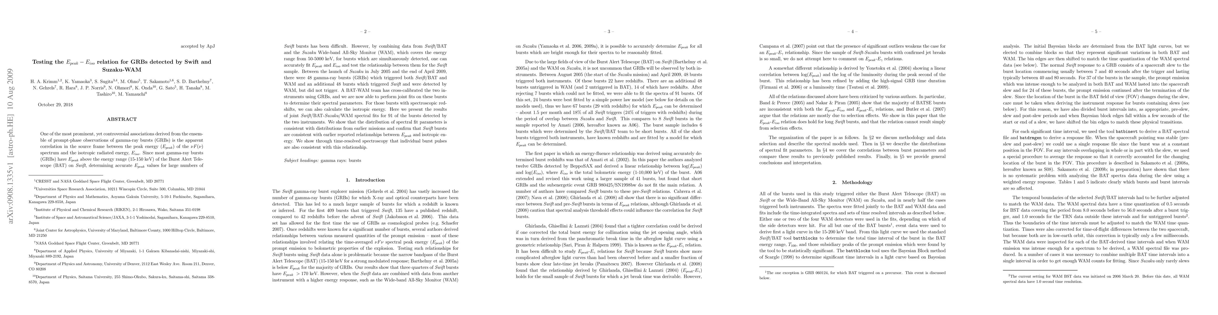 This paper tests the correlation between the peak energy (Epeak) and isotropic radiated energy (Eiso) of gamma-ray bursts (GRBs) using combined Swift/BAT and Suzaku/WAM data. The study confirms earlier relationships between Epeak and Eiso, showing consistency across spectral fits and individual burst pulses.