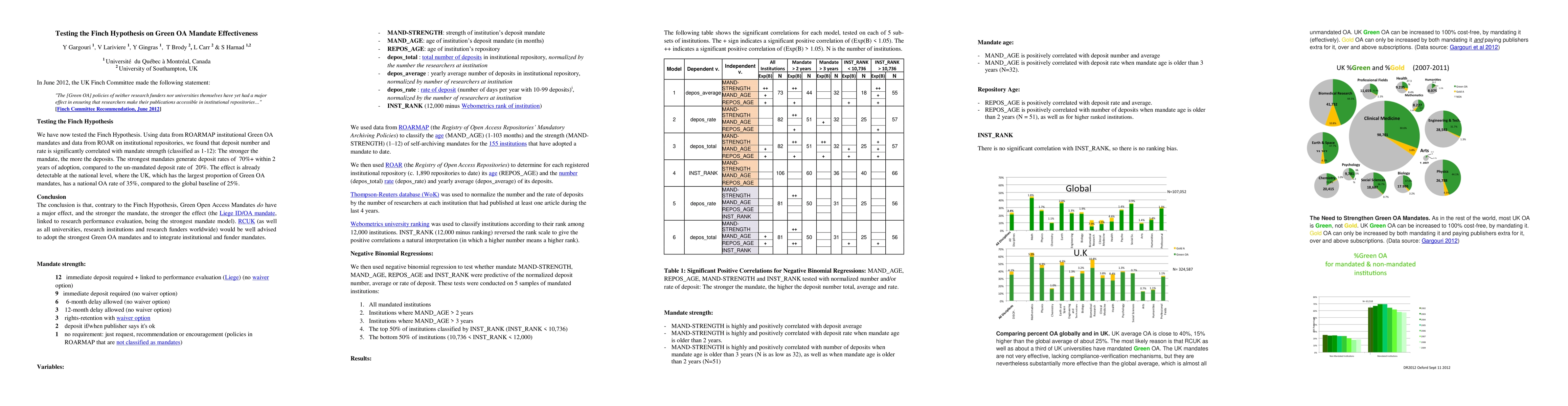 We have now tested the Finch Committee's Hypothesis that Green Open Access Mandates are ineffective in generating deposits in institutional repositories. With data from ROARMAP on institutional Green OA mandates and data from ROAR on institutional repositories, we show that deposit number and rate is significantly correlated with mandate strength (classified as 1-12): The stronger the mandate, the more the deposits. The strongest mandates generate deposit rates of 70%+ within 2 years of adoption, compared to the un-mandated deposit rate of 20%. The effect is already detectable at the national level, where the UK, which has the largest proportion of Green OA mandates, has a national OA rate of 35%, compared to the global baseline of 25%. The conclusion is that, contrary to the Finch Hypothesis, Green Open Access Mandates do have a major effect, and the stronger the mandate, the stronger the effect (the Liege ID/OA mandate, linked to research performance evaluation, being the strongest mandate model). RCUK (as well as all universities, research institutions and research funders worldwide) would be well advised to adopt the strongest Green OA mandates and to integrate institutional and funder mandates.