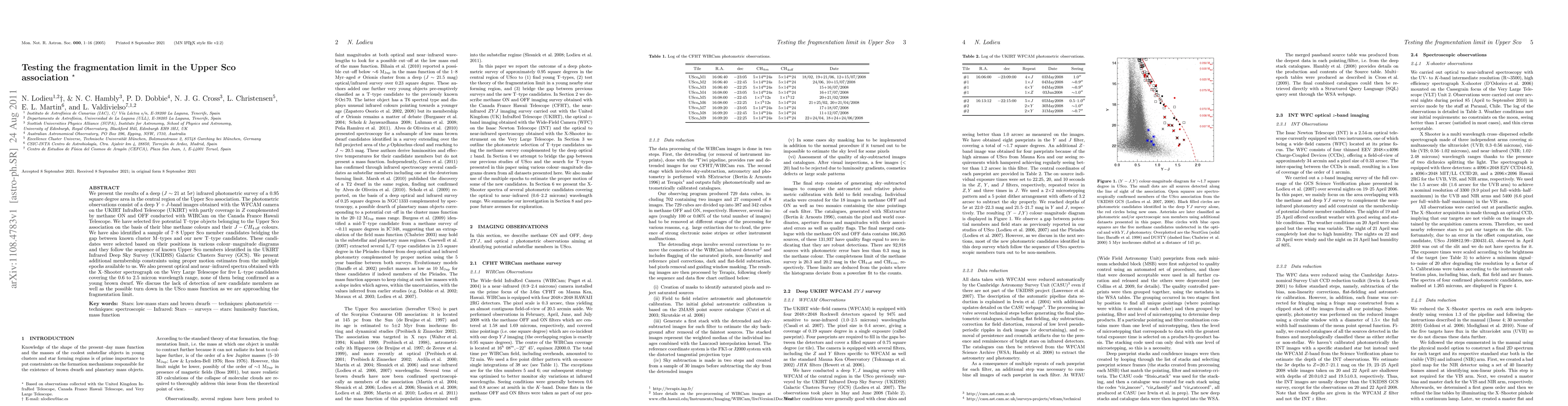 We present the results of a deep (J ~ 21 mag at 5 sigma) infrared photometric survey of a 0.95 square degree area in the central region of the Upper Sco association. The photometric observations consist of a deep (Y+J)-band images obtained with the WFCAM camera on the UKIRT InfraRed Telescope (UKIRT) with partly coverage in Z complemented by methane ON and OFF conducted with WIRCam on the Canada France Hawaii Telescope. We have selected five potential T-type objects belonging to the Upper Sco association on the basis of their blue methane colours and their J-CH4off colours. We have also identified a sample of 7-8 Upper Sco member candidates bridging the gap between known cluster M-types and our new T-type candidates. These candidates were selected based on their positions in various colour-magnitude diagrams and they follow the sequence of known Upper Sco members identified in the UKIRT Infrared Deep Sky Survey (UKIDSS) Galactic Clusters Survey (GCS). We present additional membership constraints using proper motion estimates from the multiple epochs available to us. We also present optical and near-infrared spectra obtained with the X--Shooter spectrograph on the Very Large Telescope for five L-type candidates covering the 0.6 to 2.5 micron wavelength range, none of them being confirmed as a young brown dwarf. We discuss the lack of detection of new candidate members as well as the possible turn down in the USco mass function as we are approaching the fragmentation limit.