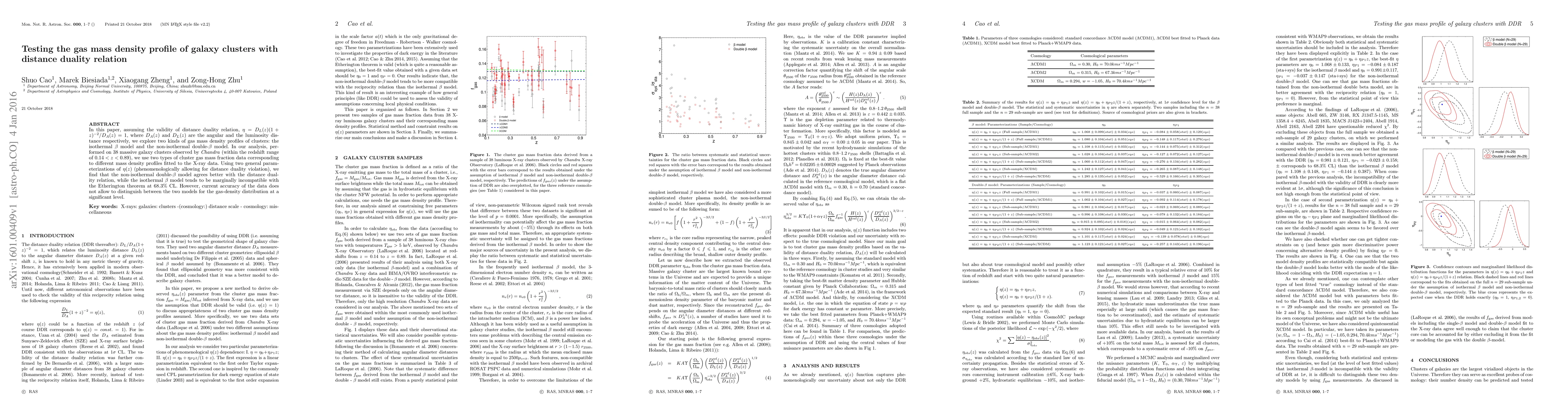 Researchers tested two gas mass density profiles of galaxy clusters using Chandra data, finding that one profile agrees better with the distance duality relation than the other.