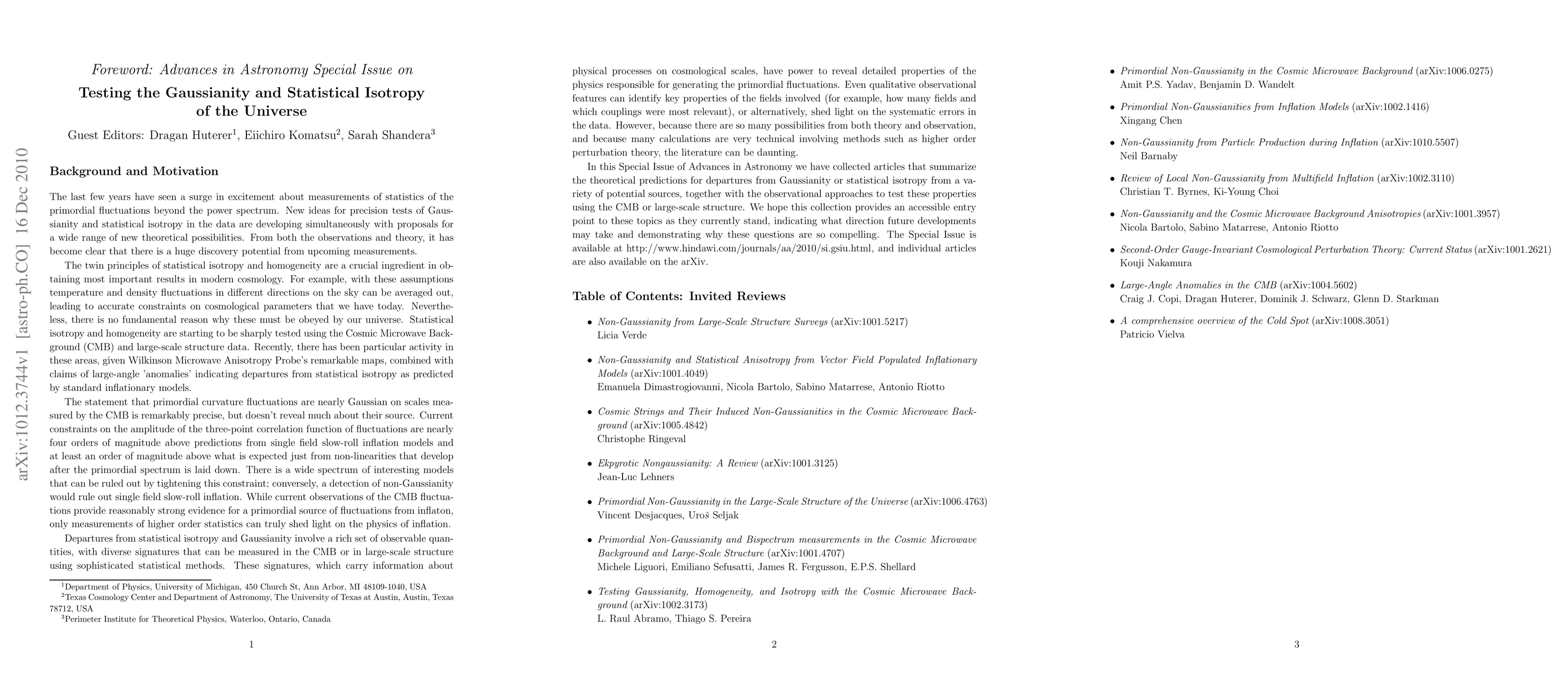 The last few years have seen a surge in excitement about measurements of statistics of the primordial fluctuations beyond the power spectrum. New ideas for precision tests of Gaussianity and statistical isotropy in the data are developing simultaneously with proposals for a wide range of new theoretical possibilities. From both the observations and theory, it has become clear that there is a huge discovery potential from upcoming measurements. In this Special Issue of Advances in Astronomy we have collected articles that summarize the theoretical predictions for departures from Gaussianity or statistical isotropy from a variety of potential sources, together with the observational approaches to test these properties using the CMB or large-scale structure. We hope this collection provides an accessible entry point to these topics as they currently stand, indicating what direction future developments may take and demonstrating why these questions are so compelling. The Special Issue is available at http://www.hindawi.com/journals/aa/2010/si.gsiu.html, and individual articles are also available on the arXiv.