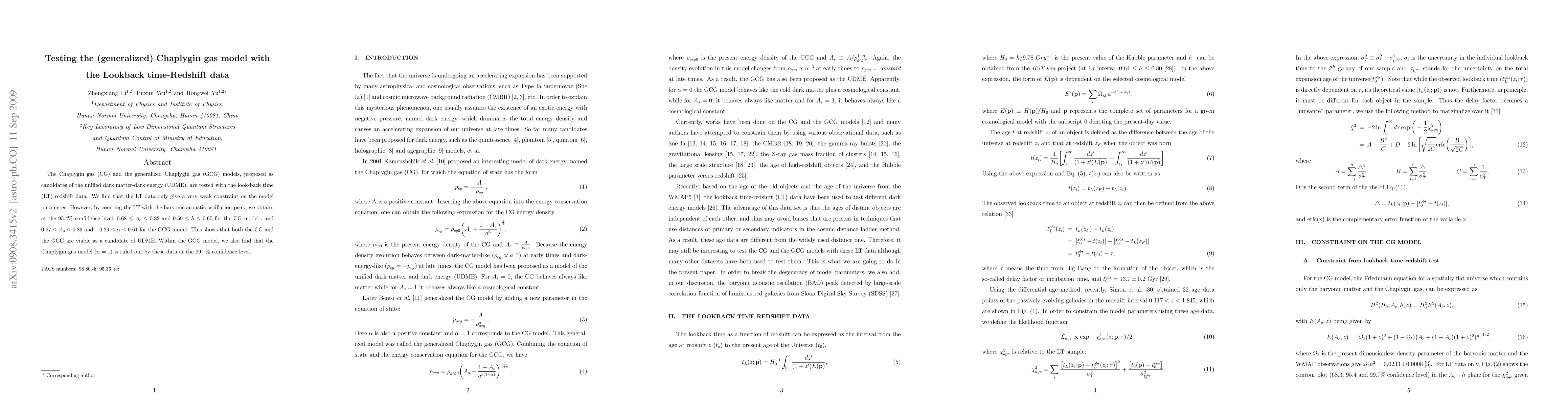 This paper tests the Chaplygin gas and its generalized version against lookback time-redshift data, finding weak constraints alone but stronger constraints when combined with baryonic acoustic oscillation peaks, supporting both models as viable unified dark matter-dark energy candidates. The Chaplygin gas model ($\alpha=1$) is ruled out at a 99.7% confidence level within the generalized model.