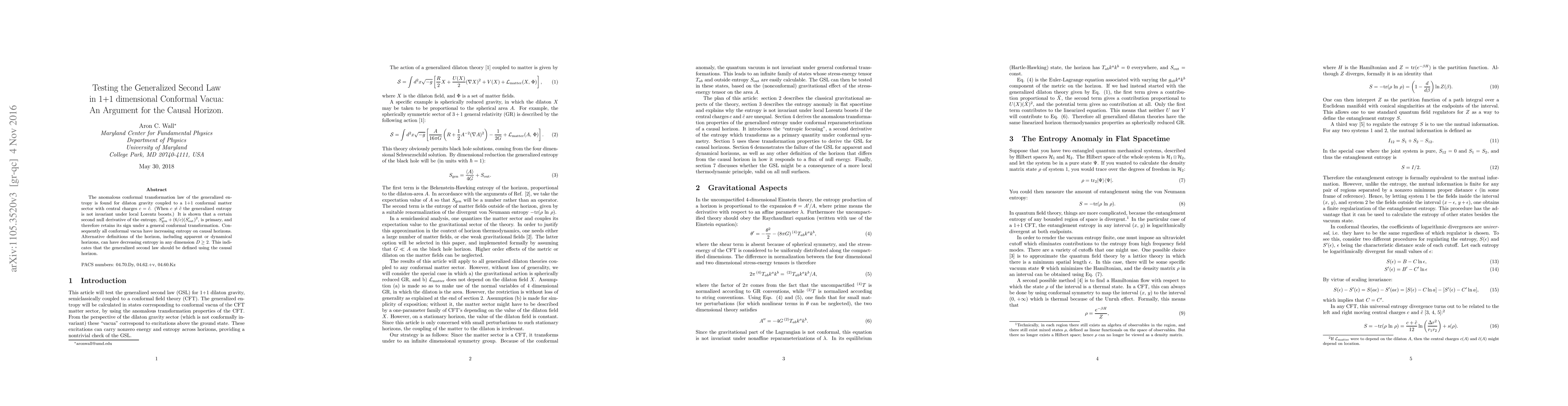 The anomalous conformal transformation law of the generalized entropy is found for dilaton gravity coupled to a 1+1 conformal matter sector with central charges $c = \tilde{c}$. (When $c \ne \tilde{c}$ the generalized entropy is not invariant under local Lorentz boosts.) It is shown that a certain second null derivative of the entropy, $S_\text{gen}" + (6/c)(S_\text{out}')^2$, is primary, and therefore retains its sign under a general conformal transformation. Consequently all conformal vacua have increasing entropy on causal horizons. Alternative definitions of the horizon, including apparent or dynamical horizons, can have decreasing entropy in any dimension $D \ge 2$. This indicates that the generalized second law should be defined using the causal horizon.