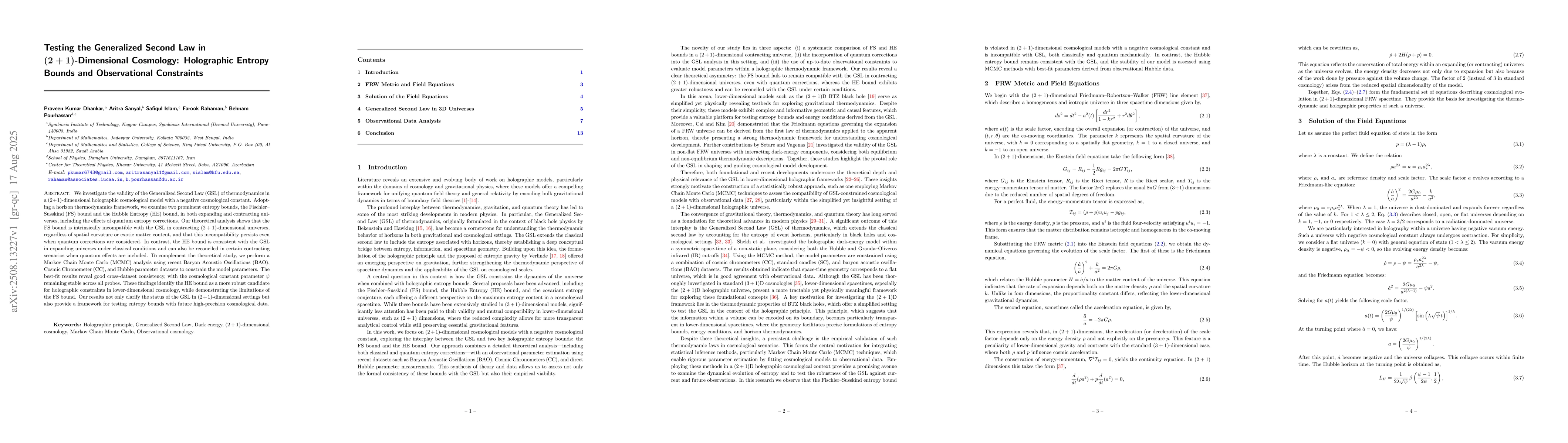 We investigate the validity of the Generalized Second Law (GSL) of thermodynamics in a $(2+1)$-dimensional holographic cosmological model with a negative cosmological constant. Adopting a horizon thermodynamics framework, we examine two prominent entropy bounds, the Fischler--Susskind (FS) bound and the Hubble Entropy (HE) bound, in both expanding and contracting universes, including the effects of quantum entropy corrections. Our theoretical analysis shows that the FS bound is intrinsically incompatible with the GSL in contracting $(2+1)$-dimensional universes, regardless of spatial curvature or exotic matter content, and that this incompatibility persists even when quantum corrections are considered. In contrast, the HE bound is consistent with the GSL in expanding universes under classical conditions and can also be reconciled in certain contracting scenarios when quantum effects are included. To complement the theoretical study, we perform a Markov Chain Monte Carlo (MCMC) analysis using recent Baryon Acoustic Oscillations (BAO), Cosmic Chronometer (CC), and Hubble parameter datasets to constrain the model parameters. The best-fit results reveal good cross-dataset consistency, with the cosmological constant parameter $\psi$ remaining stable across all probes. These findings identify the HE bound as a more robust candidate for holographic constraints in lower-dimensional cosmology, while demonstrating the limitations of the FS bound. Our results not only clarify the status of the GSL in $(2+1)$-dimensional settings but also provide a framework for testing entropy bounds with future high-precision cosmological data.