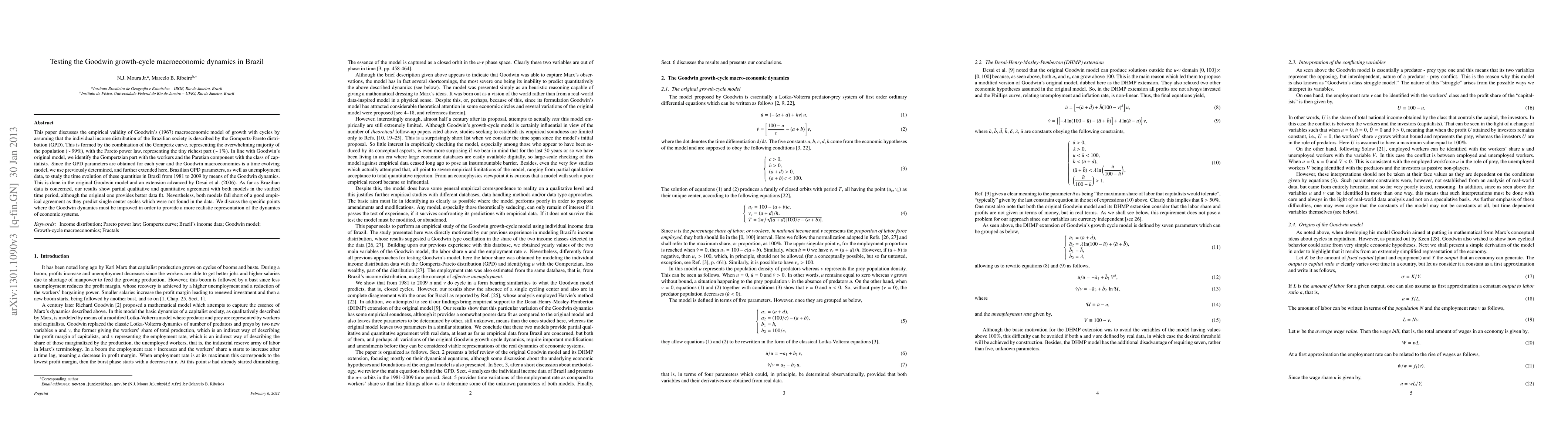 This paper discusses the empirical validity of Goodwin's (1967) macroeconomic model of growth with cycles by assuming that the individual income distribution of the Brazilian society is described by the Gompertz-Pareto distribution (GPD). This is formed by the combination of the Gompertz curve, representing the overwhelming majority of the population (~99%), with the Pareto power law, representing the tiny richest part (~1%). In line with Goodwin's original model, we identify the Gompertzian part with the workers and the Paretian component with the class of capitalists. Since the GPD parameters are obtained for each year and the Goodwin macroeconomics is a time evolving model, we use previously determined, and further extended here, Brazilian GPD parameters, as well as unemployment data, to study the time evolution of these quantities in Brazil from 1981 to 2009 by means of the Goodwin dynamics. This is done in the original Goodwin model and an extension advanced by Desai et al. (2006). As far as Brazilian data is concerned, our results show partial qualitative and quantitative agreement with both models in the studied time period, although the original one provides better data fit. Nevertheless, both models fall short of a good empirical agreement as they predict single center cycles which were not found in the data. We discuss the specific points where the Goodwin dynamics must be improved in order to provide a more realistic representation of the dynamics of economic systems.