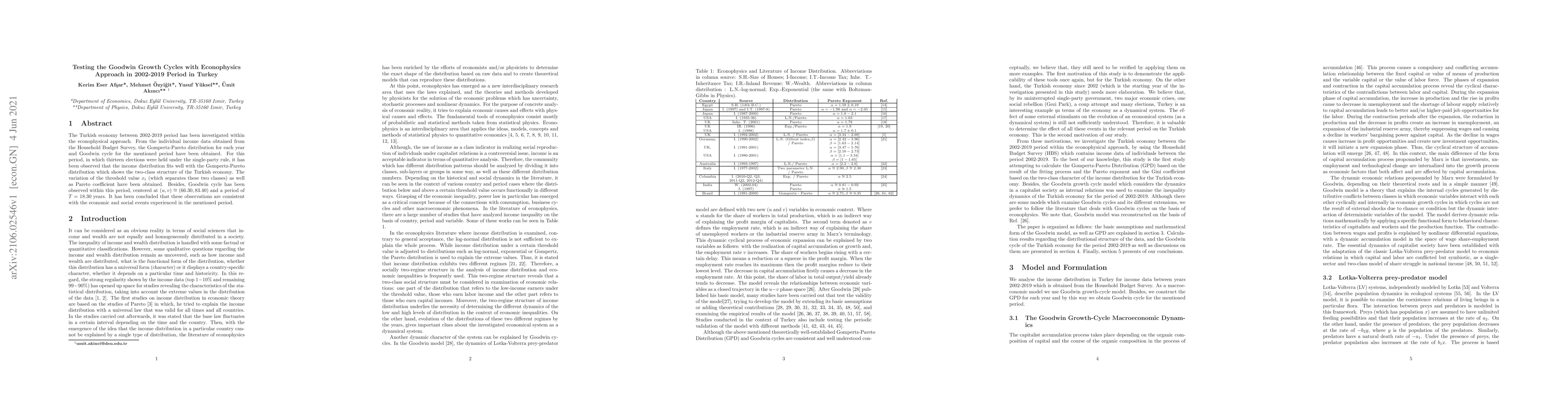 The Turkish economy between 2002-2019 period has been investigated within the econophysical approach. From the individual income data obtained from the Household Budget Survey, the Gompertz-Pareto distribution for each year and Goodwin cycle for the mentioned period have been obtained. For this period, in which thirteen elections were held under the single-party rule, it has been observed that the income distribution fits well with the Gompertz-Pareto distribution which shows the two-class structure of the Turkish economy. The variation of the threshold value $x_t$ (which separates these two classes) as well as Pareto coefficient have been obtained. Besides, Goodwin cycle has been observed within this period, centered at $(u,v)\cong (66.30,83.40)$ and a period of $T=18.30$ years. It has been concluded that these observations are consistent with the economic and social events experienced in the mentioned period.
