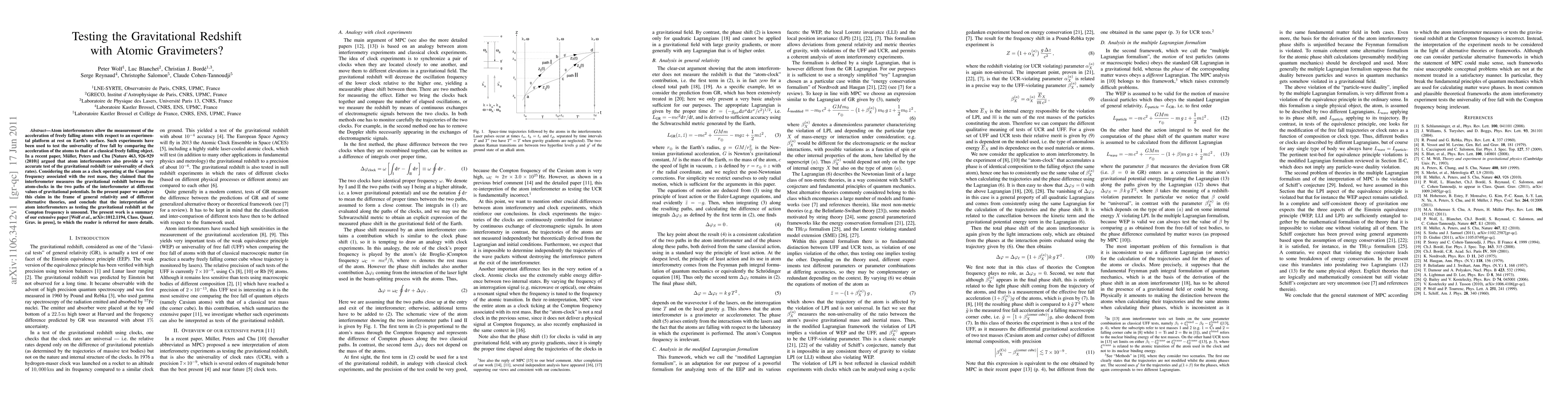 Atom interferometers allow the measurement of the acceleration of freely falling atoms with respect to an experimental platform at rest on Earth's surface. Such experiments have been used to test the universality of free fall by comparing the acceleration of the atoms to that of a classical freely falling object. In a recent paper, M\"uller, Peters and Chu [Nature {\bf 463}, 926-929 (2010)] argued that atom interferometers also provide a very accurate test of the gravitational redshift (or universality of clock rates). Considering the atom as a clock operating at the Compton frequency associated with the rest mass, they claimed that the interferometer measures the gravitational redshift between the atom-clocks in the two paths of the interferometer at different values of gravitational potentials. In the present paper we analyze this claim in the frame of general relativity and of different alternative theories, and conclude that the interpretation of atom interferometers as testing the gravitational redshift at the Compton frequency is unsound. The present work is a summary of our extensive paper [Wolf et al., arXiv:1012.1194, Class. Quant. Grav. 28, 145017, (2011)], to which the reader is referred for more details.