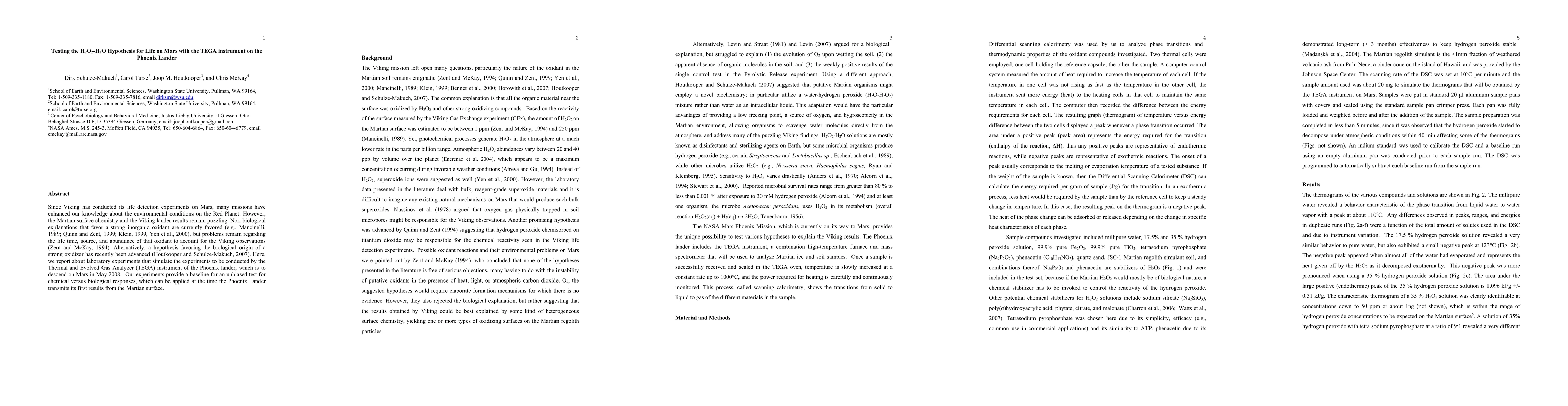This research tests the hypothesis that hydrogen peroxide and water could be biological indicators of life on Mars using the TEGA instrument on the Phoenix Lander. Laboratory experiments simulate TEGA's Martian surface tests to provide a baseline for distinguishing between chemical and biological origins of strong oxidizers, addressing longstanding questions about Martian surface chemistry.