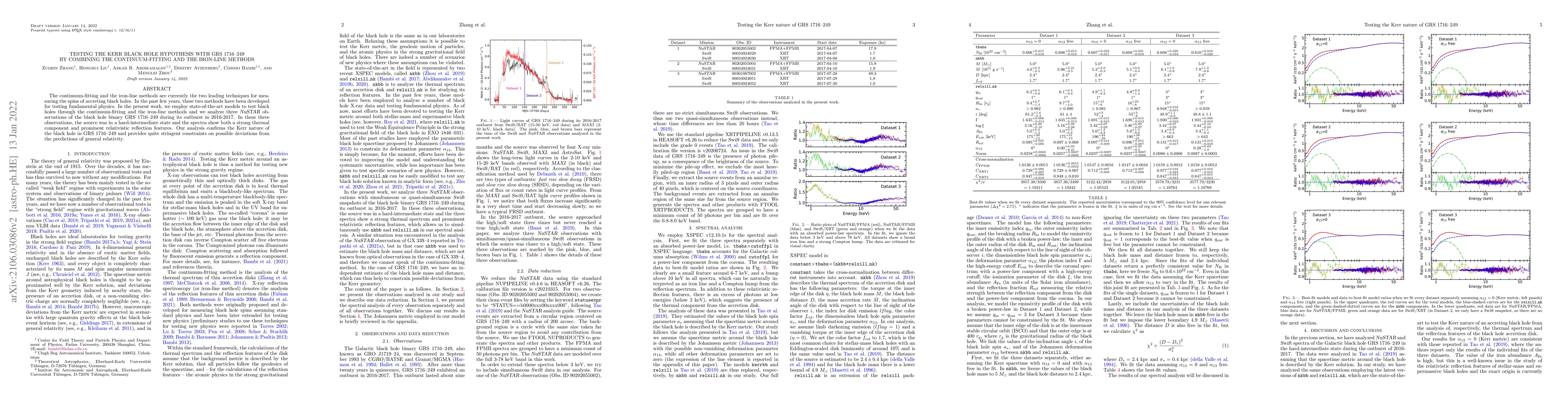This research combines continuum-fitting and iron-line methods to test the Kerr black hole hypothesis for GRS 1716-249 using NuSTAR observations. The analysis confirms the black hole's Kerr nature and imposes stringent constraints on deviations from general relativity predictions.
