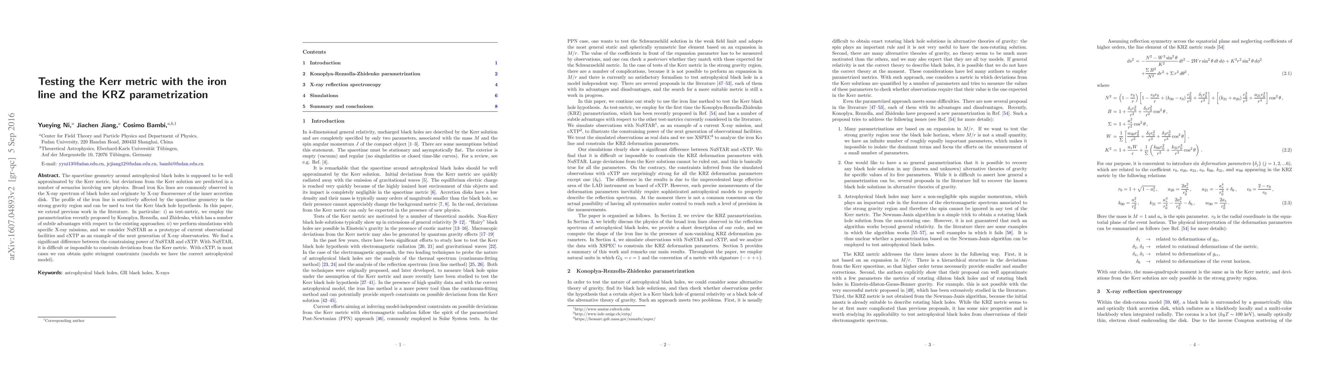 This paper tests the Kerr metric using the iron line in X-ray spectra from black holes, employing the KRZ parametrization for deviations. It finds that while current NuSTAR observations struggle to constrain deviations, the next-generation eXTP observatory could provide stringent constraints, assuming the correct astrophysical model.