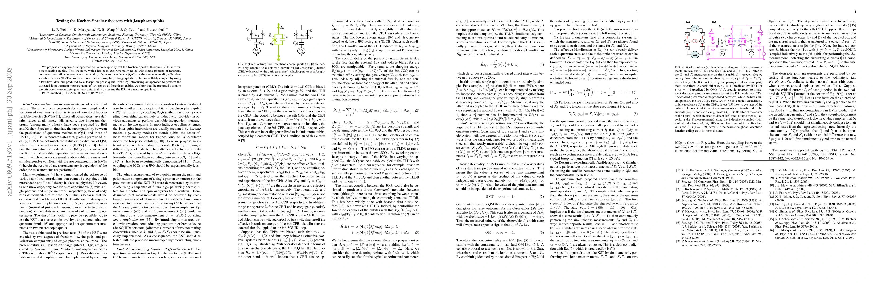 This paper proposes a macroscopic experimental test of the Kochen-Specker theorem using superconducting Josephson qubits, aiming to demonstrate quantum contextuality through joint quantum measurements. The approach leverages controllably coupled Josephson charge qubits via a Josephson phase qubit data bus.