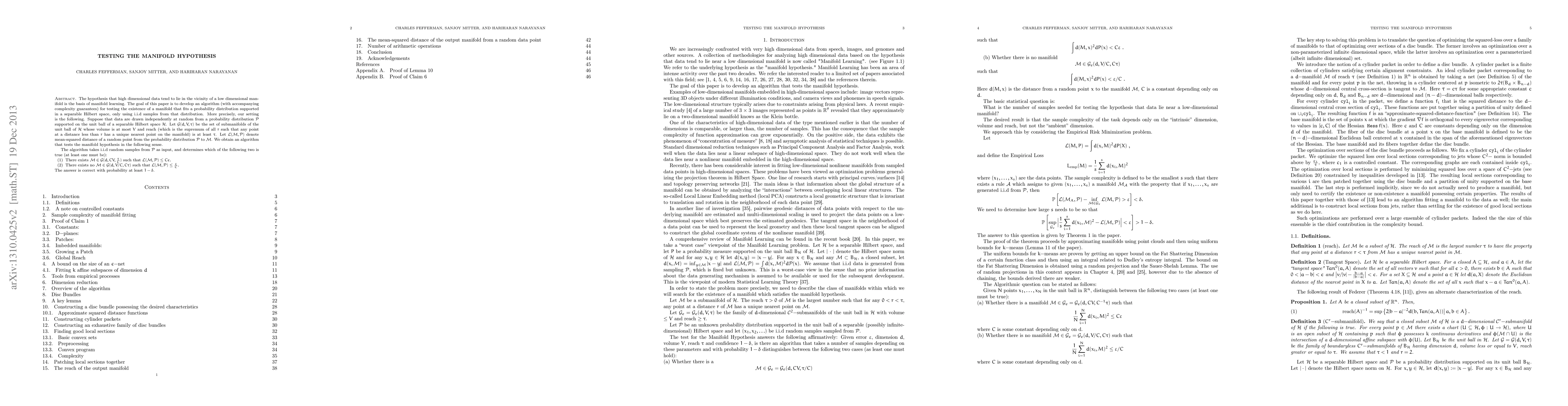 The hypothesis that high dimensional data tend to lie in the vicinity of a low dimensional manifold is the basis of manifold learning. The goal of this paper is to develop an algorithm (with accompanying complexity guarantees) for fitting a manifold to an unknown probability distribution supported in a separable Hilbert space, only using i.i.d samples from that distribution. More precisely, our setting is the following. Suppose that data are drawn independently at random from a probability distribution $P$ supported on the unit ball of a separable Hilbert space $H$. Let $G(d, V, \tau)$ be the set of submanifolds of the unit ball of $H$ whose volume is at most $V$ and reach (which is the supremum of all $r$ such that any point at a distance less than $r$ has a unique nearest point on the manifold) is at least $\tau$. Let $L(M, P)$ denote mean-squared distance of a random point from the probability distribution $P$ to $M$. We obtain an algorithm that tests the manifold hypothesis in the following sense. The algorithm takes i.i.d random samples from $P$ as input, and determines which of the following two is true (at least one must be): (a) There exists $M \in G(d, CV, \frac{\tau}{C})$ such that $L(M, P) \leq C \epsilon.$ (b) There exists no $M \in G(d, V/C, C\tau)$ such that $L(M, P) \leq \frac{\epsilon}{C}.$ The answer is correct with probability at least $1-\delta$.