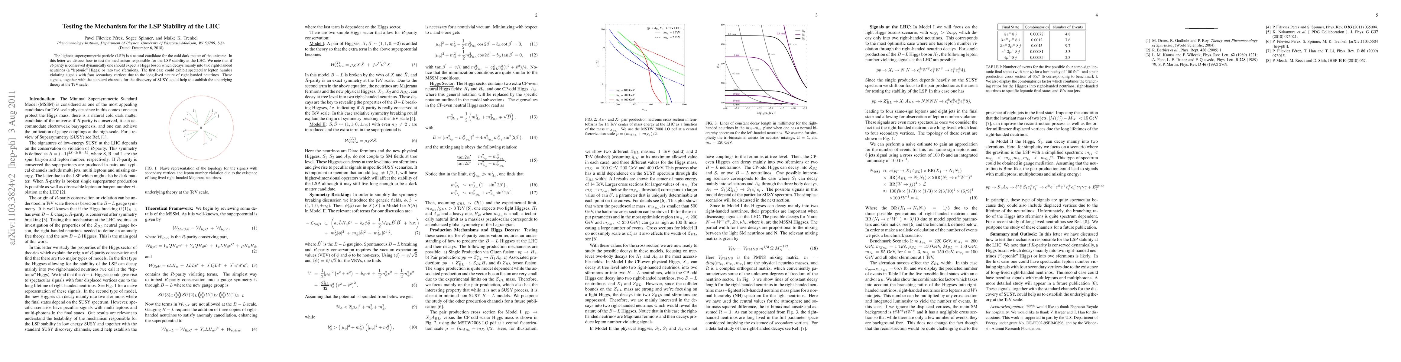 The research discusses testing the mechanism for LSP stability at the LHC by analyzing Higgs boson decays into either two right-handed neutrinos (leptonic Higgs) or two sfermions, which could exhibit unique lepton number violating signals and help establish the underlying theory at the TeV scale.