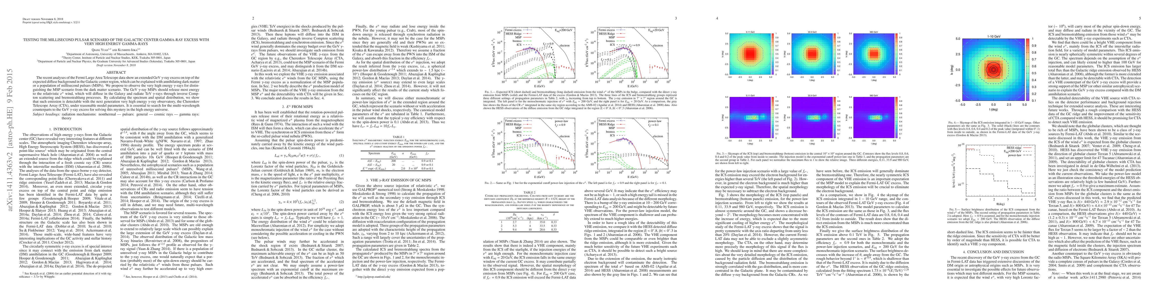 This paper investigates the potential of very high energy gamma-rays to distinguish between the Galactic center gamma-ray excess being caused by annihilating dark matter or millisecond pulsars. The Cherenkov Telescope Array (CTA) is proposed to detect TeV gamma-rays from relativistic electron-positron winds from MSPs, providing a crucial test for the pulsar scenario.