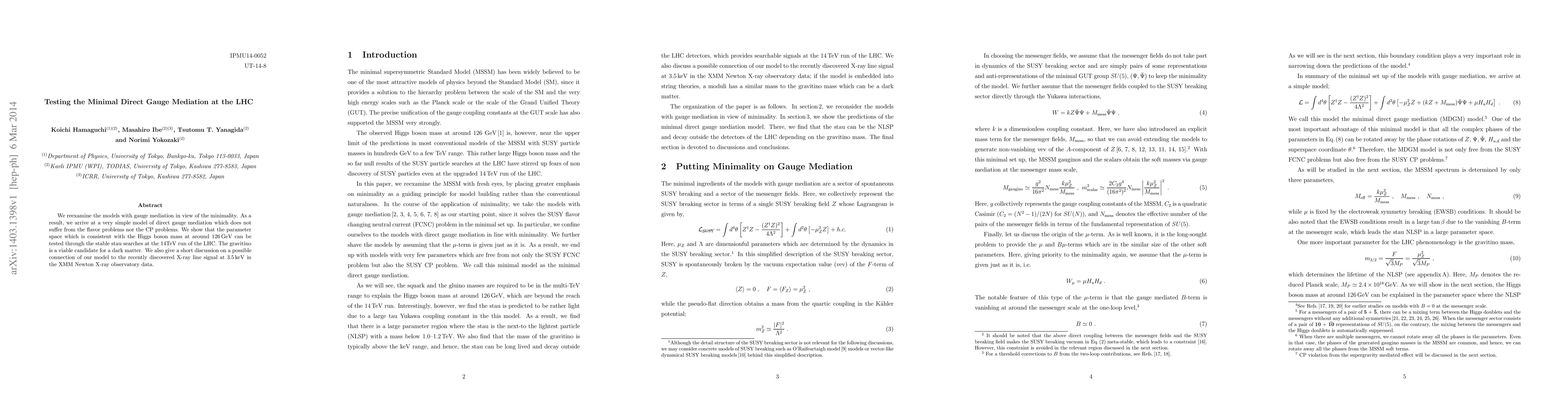 This paper proposes a minimal direct gauge mediation model that avoids flavor and CP problems, suggesting it can be tested via stable stau searches at the LHC's 14 TeV run. The gravitino is identified as a viable dark matter candidate, and a potential link to the 3.5 keV X-ray line signal is briefly discussed.