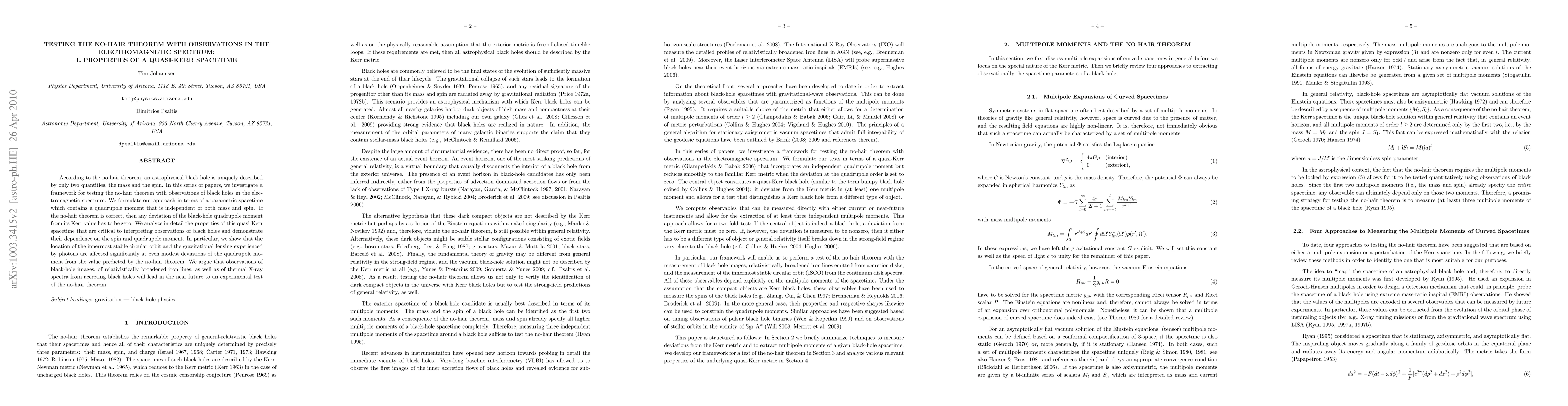 According to the no-hair theorem, an astrophysical black hole is uniquely described by only two quantities, the mass and the spin. In this series of papers, we investigate a framework for testing the no-hair theorem with observations of black holes in the electromagnetic spectrum. We formulate our approach in terms of a parametric spacetime which contains a quadrupole moment that is independent of both mass and spin. If the no-hair theorem is correct, then any deviation of the black-hole quadrupole moment from its Kerr value has to be zero. We analyze in detail the properties of this quasi-Kerr spacetime that are critical to interpreting observations of black holes and demonstrate their dependence on the spin and quadrupole moment. In particular, we show that the location of the innermost stable circular orbit and the gravitational lensing experienced by photons are affected significantly at even modest deviations of the quadrupole moment from the value predicted by the no-hair theorem. We argue that observations of black-hole images, of relativistically broadened iron lines, as well as of thermal X-ray spectra from accreting black holes will lead in the near future to an experimental test of the no-hair theorem.