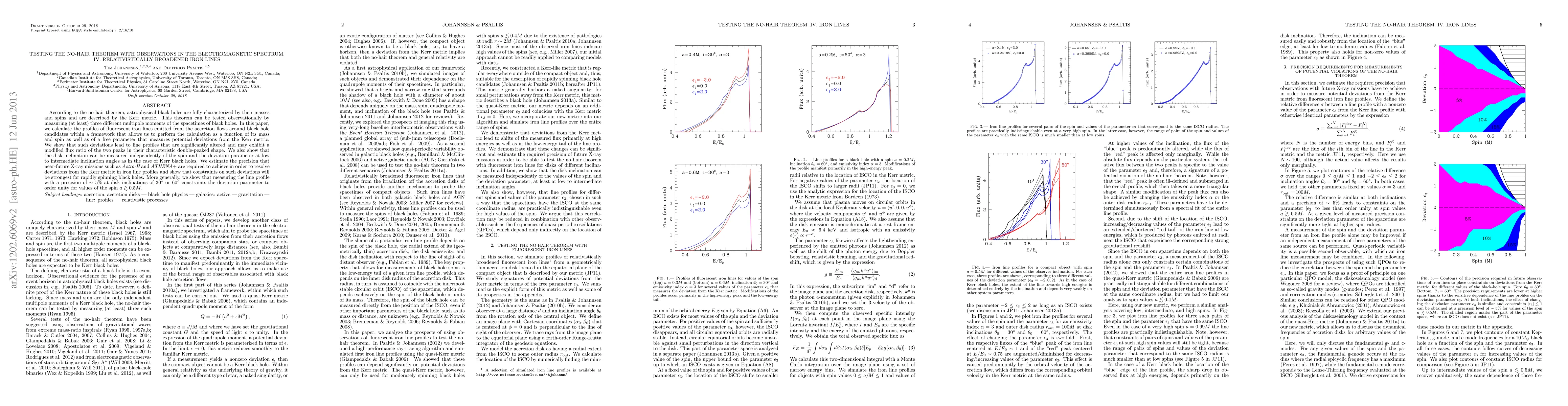 According to the no-hair theorem, astrophysical black holes are fully characterized by their masses and spins and are described by the Kerr metric. This theorem can be tested observationally by measuring (at least) three different multipole moments of the spacetimes of black holes. In this paper, we calculate the profiles of fluorescent iron lines emitted from the accretion flows around black hole candidates within a framework that allows us to perform the calculation as a function of its mass and spin as well as of a free parameter that measures potential deviations from the Kerr metric. We show that such deviations lead to line profiles that are significantly altered and may exhibit a modified flux ratio of the two peaks in their characteristic double-peaked shape. We also show that the disk inclination can be measured independently of the spin and the deviation parameter at low to intermediate inclination angles as in the case of Kerr black holes. We estimate the precision that near-future X-ray missions such as Astro-H and ATHENA+ are required to achieve in order to resolve deviations from the Kerr metric in iron line profiles and show that constraints on such deviations will be strongest for rapidly spinning black holes. More generally, we show that measuring the line profile with a precision of ~5% at disk inclinations of 30 or 60 degrees constraints the deviation parameter to order unity for values of the spin a>0.5M.