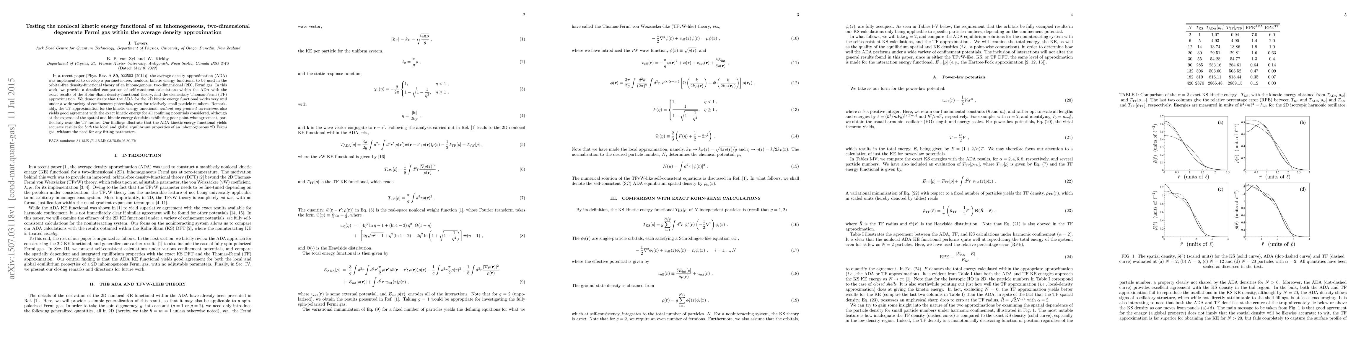 In a recent paper [Phys.~Rev.~A {\bf 89}, 022503 (2014)], the average density approximation (ADA) was implemented to develop a parameter-free, nonlocal kinetic energy functional to be used in the orbital-free density-functional theory of an inhomogenous, two-dimensional (2D), Fermi gas. In this work, we provide a detailed comparison of self-consistent calculations within the ADA with the exact results of the Kohn-Sham density-functional theory, and the elementary Thomas-Fermi (TF) approximation. We demonstrate that the ADA for the 2D kinetic energy functional works very well under a wide variety of confinement potentials, even for relatively small particle numbers. Remarkably, the TF approximation for the kinetic energy functional, {\em without any gradient corrections}, also yields good agreement with the exact kinetic energy for all confining potentials considered, although at the expense of the spatial and kinetic energy densities exhibiting poor point-wise agreement, particularly near the TF radius. Our findings illustrate that the ADA kinetic energy functional yields accurate results for {\em both} the local and global equilibrium properties of an inhomogeneous 2D Fermi gas, without the need for any fitting parameters.