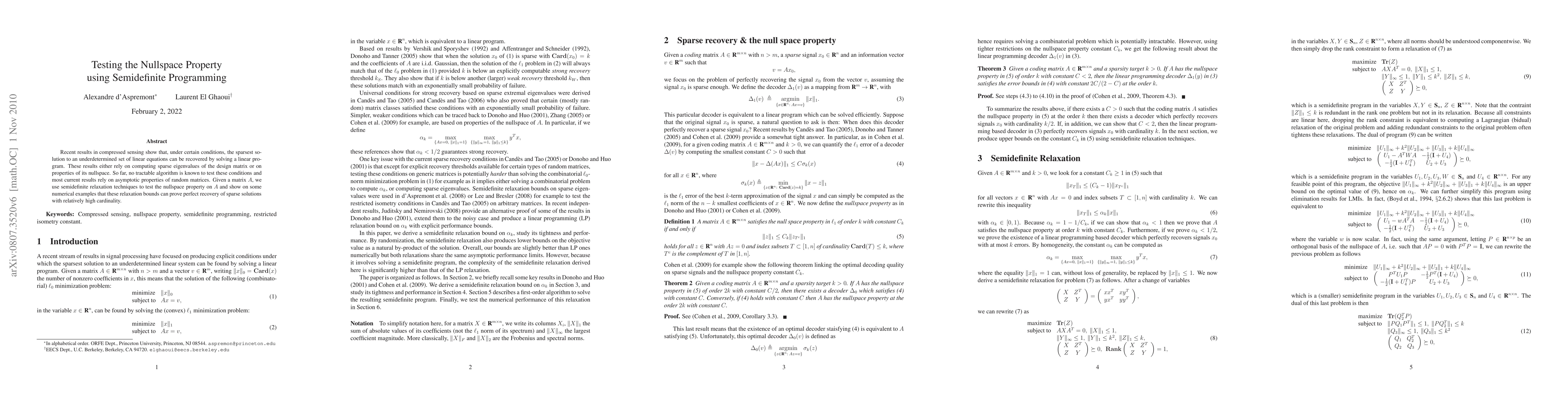 Recent results in compressed sensing show that, under certain conditions, the sparsest solution to an underdetermined set of linear equations can be recovered by solving a linear program. These results either rely on computing sparse eigenvalues of the design matrix or on properties of its nullspace. So far, no tractable algorithm is known to test these conditions and most current results rely on asymptotic properties of random matrices. Given a matrix A, we use semidefinite relaxation techniques to test the nullspace property on A and show on some numerical examples that these relaxation bounds can prove perfect recovery of sparse solutions with relatively high cardinality.