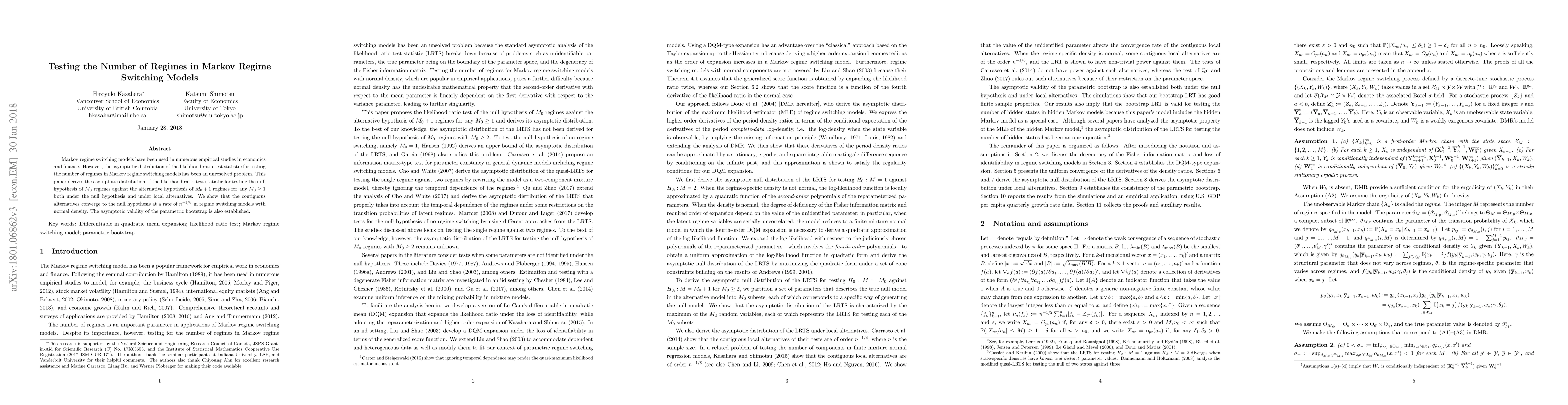 This paper derives the asymptotic distribution for the likelihood ratio test in Markov regime switching models to determine the number of regimes, resolving previous uncertainties. It shows that contiguous alternatives converge to the null hypothesis at a rate of $n^{-1/8}$ and validates the parametric bootstrap's asymptotic properties.