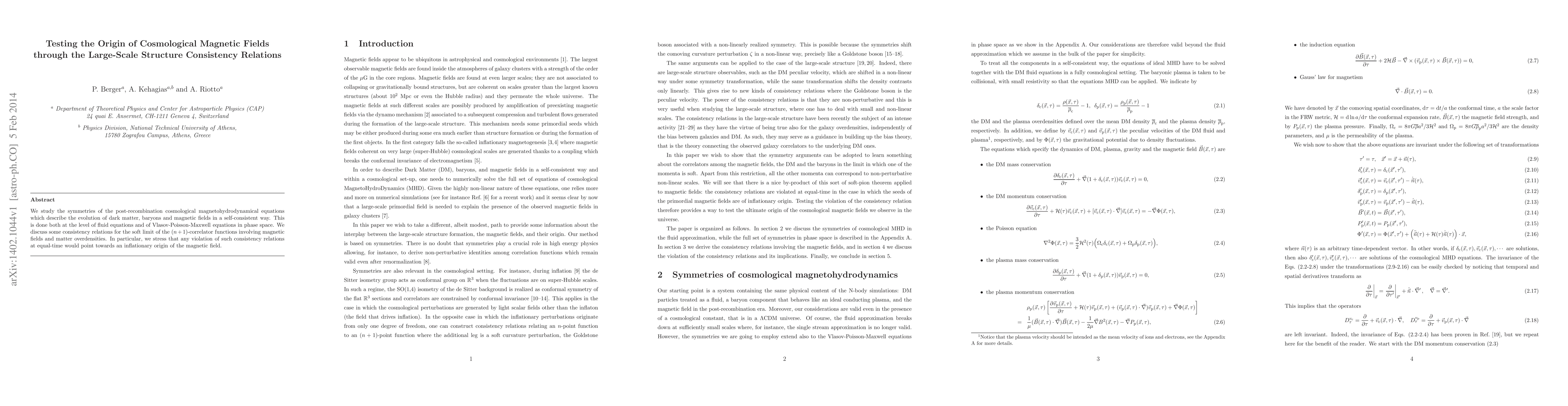 This paper investigates the symmetries in the cosmological magnetohydrodynamical equations to explore the origin of magnetic fields, emphasizing consistency relations that could indicate an inflationary origin if violated. The study combines fluid and Vlasov-Poisson-Maxwell equations to analyze the large-scale structure.