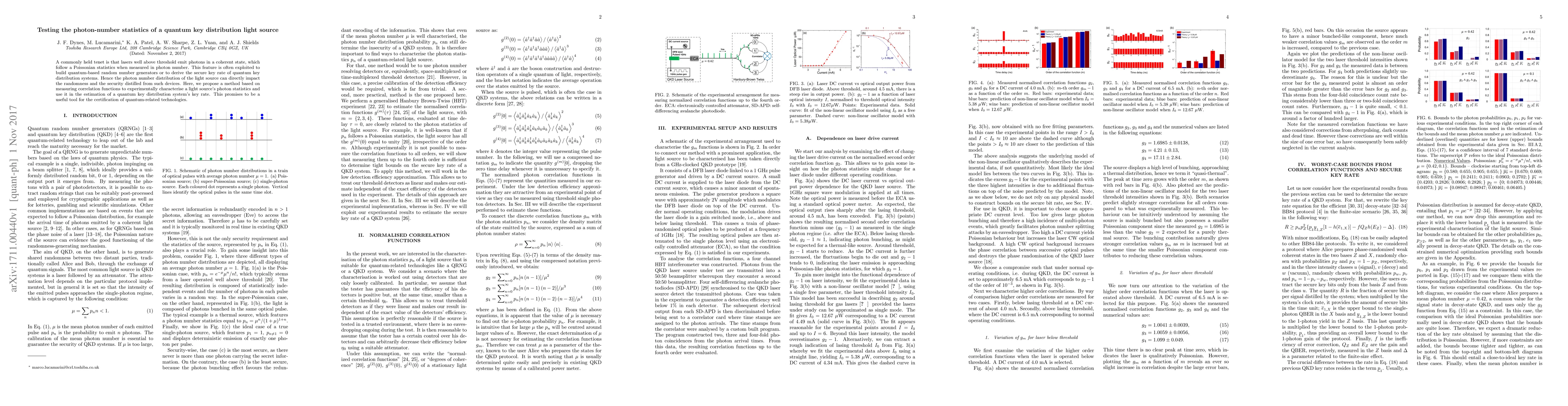 A commonly held tenet is that lasers well above threshold emit photons in a coherent state, which follow a Poissonian statistics when measured in photon number. This feature is often exploited to build quantum-based random number generators or to derive the secure key rate of quantum key distribution systems. Hence the photon number distribution of the light source can directly impact the randomness and the security distilled from such devices. Here, we propose a method based on measuring correlation functions to experimentally characterise a light source's photon statistics and use it in the estimation of a quantum key distribution system's key rate. This promises to be a useful tool for the certification of quantum-related technologies.
