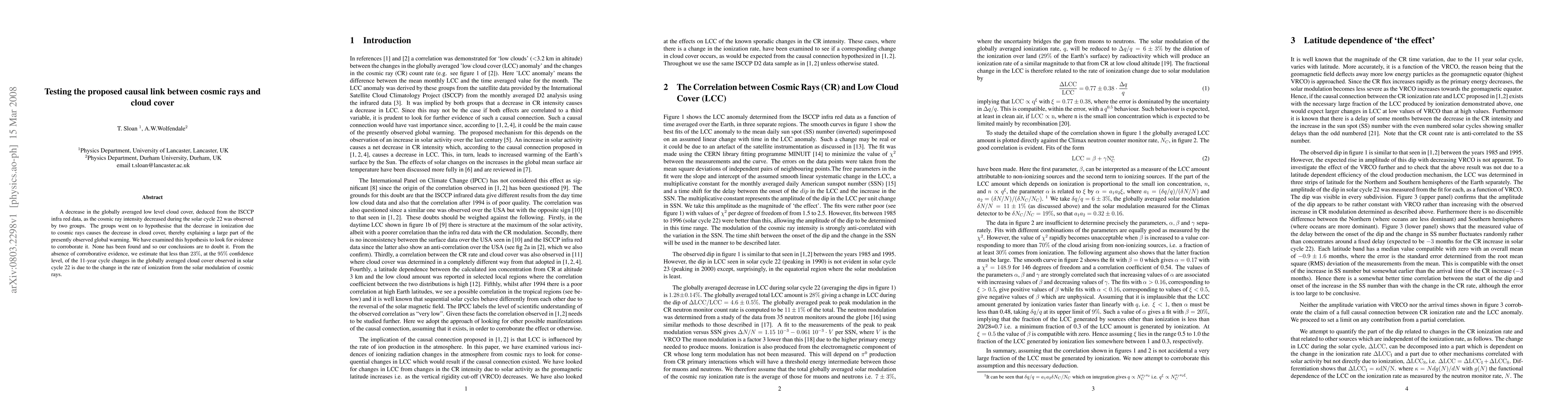 This study investigates the hypothesized link between cosmic ray intensity and low-level cloud cover, finding no corroborative evidence to support the claim that cosmic rays significantly influence cloud cover and global warming. The research concludes that cosmic rays account for less than 23% of the observed cloud cover changes during solar cycle 22.