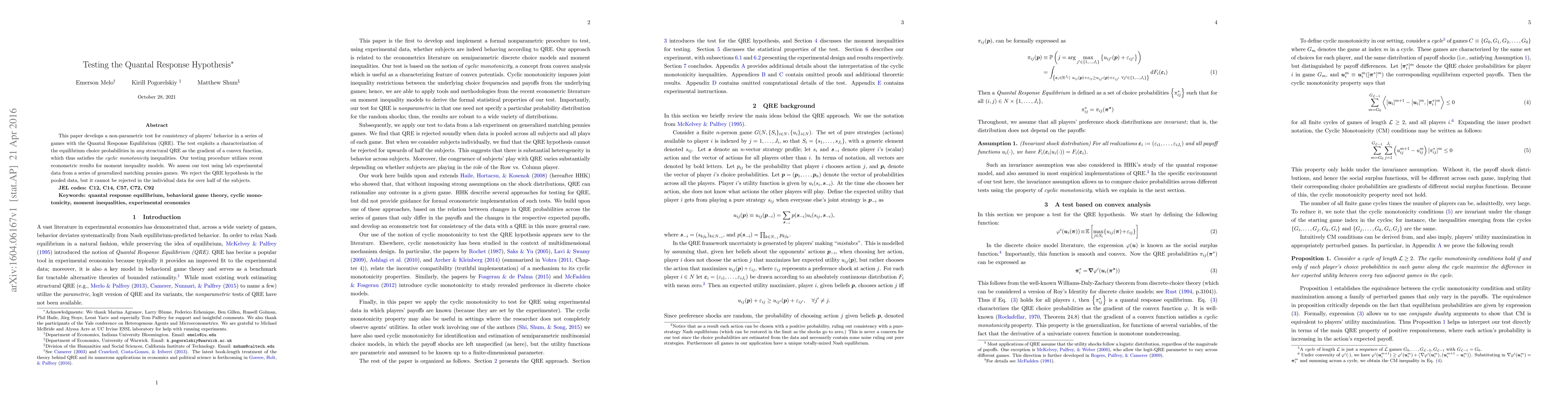 This paper proposes a non-parametric test to evaluate the consistency of players' behavior with the Quantal Response Equilibrium (QRE) in repeated games, finding that the QRE hypothesis is rejected in pooled data but not in individual data for most subjects. The test leverages the cyclic monotonicity inequalities and recent econometric results for moment inequality models.