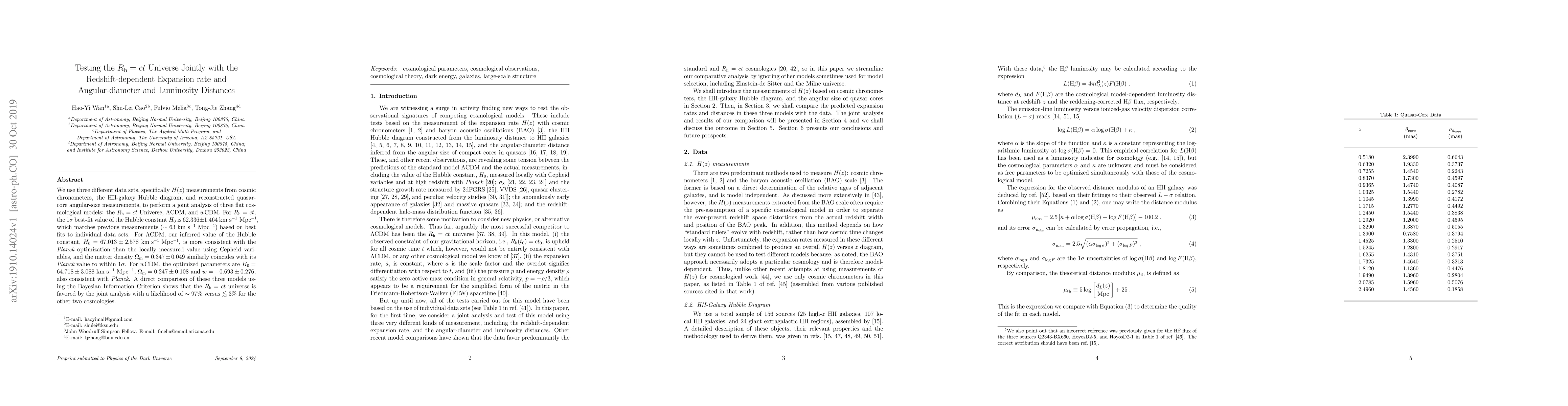 We use three different data sets, specifically $H(z)$ measurements from cosmic chronometers, the HII-galaxy Hubble diagram, and reconstructed quasar-core angular-size measurements, to perform a joint analysis of three flat cosmological models: the $R_{\rm h}=ct$ Universe, $\Lambda$CDM, and $w$CDM. For $R_{\rm h}=ct$, the 1$\sigma$ best-fit value of the Hubble constant $H_0$ is $62.336\pm1.464$ $\mathrm{km \ s^{-1} \ Mpc^{-1}}$, which matches previous measurements ($\sim 63$ $\mathrm{km \ s^{-1} \ Mpc^{-1}}$) based on best fits to individual data sets. For $\Lambda$CDM, our inferred value of the Hubble constant, $H_0=67.013\pm2.578$ $\mathrm{km \ s^{-1} \ Mpc^{-1}}$, is more consistent with the ${\it Planck}$ optimization than the locally measured value using $\mbox{Cepheid}$ variables, and the matter density $\Omega_{\rm m}=0.347\pm0.049$ similarly coincides with its ${\it Planck}$ value to within 1$\sigma$. For $w$CDM, the optimized parameters are $H_0=64.718\pm3.088$ $\mathrm{km \ s^{-1} \ Mpc^{-1}}$, $\Omega_{\rm m}=0.247\pm0.108$ and $w=-0.693\pm0.276$, also consistent with ${\it Planck}$. A direct comparison of these three models using the Bayesian Information Criterion shows that the $R_{\rm h}=ct$ universe is favored by the joint analysis with a likelihood of $\sim 97\%$ versus $\lesssim 3\%$ for the other two cosmologies.