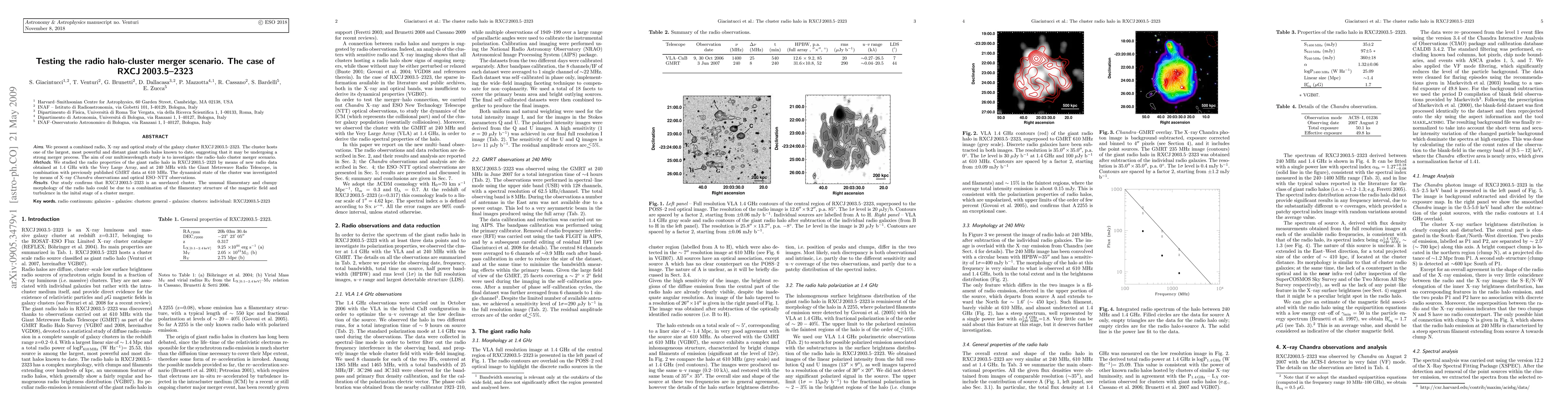We present a combined radio, X-ray and optical study of the galaxy cluster RXCJ2003.5-2323. The cluster hosts one of the largest, most powerful and distant giant radio halos known to date, suggesting that it may be undergoing a strong merger process. The aim of our multiwavelength study is to investigate the radio-halo cluster merger scenario. We studied the radio properties of the giant radio halo in RXCJ2003.5-2323 by means of new radio data obtained at 1.4 GHz with the Very Large Array, and at 240 MHz with the Giant Metrewave Radio Telescope, in combination with previously published GMRT data at 610 MHz. The dynamical state of the cluster was investigated by means of X-ray Chandra observations and optical ESO--NTT observations. Our study confirms that RXCJ2003.5-2323 is an unrelaxed cluster. The unusual filamentary and clumpy morphology of the radio halo could be due to a combination of the filamentary structure of the magnetic field and turbulence in the inital stage of a cluster merger.