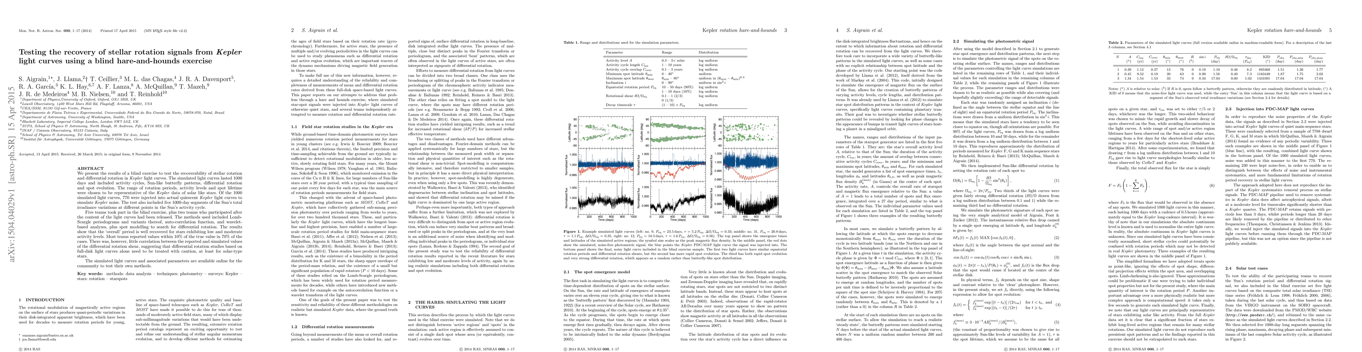 We present the results of a blind exercise to test the recoverability of stellar rotation and differential rotation in Kepler light curves. The simulated light curves lasted 1000 days and included activity cycles, Sun-like butterfly patterns, differential rotation and spot evolution. The range of rotation periods, activity levels and spot lifetime were chosen to be representative of the Kepler data of solar like stars. Of the 1000 simulated light curves, 770 were injected into actual quiescent Kepler light curves to simulate Kepler noise. The test also included five 1000-day segments of the Sun's total irradiance variations at different points in the Sun's activity cycle. Five teams took part in the blind exercise, plus two teams who participated after the content of the light curves had been released. The methods used included Lomb-Scargle periodograms and variants thereof, auto-correlation function, and wavelet-based analyses, plus spot modelling to search for differential rotation. The results show that the `overall' period is well recovered for stars exhibiting low and moderate activity levels. Most teams reported values within 10% of the true value in 70% of the cases. There was, however, little correlation between the reported and simulated values of the differential rotation shear, suggesting that differential rotation studies based on full-disk light curves alone need to be treated with caution, at least for solar-type stars. The simulated light curves and associated parameters are available online for the community to test their own methods.