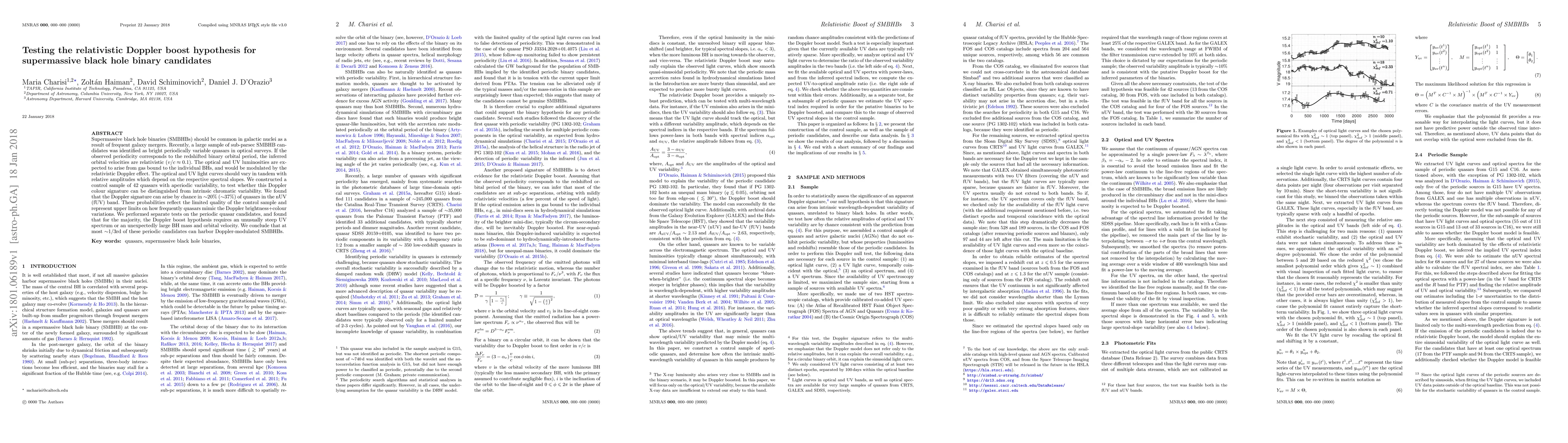 Supermassive black hole binaries (SMBHBs) should be common in galactic nuclei as a result of frequent galaxy mergers. Recently, a large sample of sub-parsec SMBHB candidates was identified as bright periodically variable quasars in optical surveys. If the observed periodicity corresponds to the redshifted binary orbital period, the inferred orbital velocities are relativistic (v/c~0.1). The optical and UV luminosities are expected to arise from gas bound to the individual BHs, and would be modulated by the relativistic Doppler effect. The optical and UV light curves should vary in tandem with relative amplitudes which depend on the respective spectral slopes. We constructed a control sample of 42 quasars with aperiodic variability, to test whether this Doppler colour signature can be distinguished from intrinsic chromatic variability. We found that the Doppler signature can arise by chance in ~20% (~37%) of quasars in the nUV (fUV) band. These probabilities reflect the limited quality of the control sample and represent upper limits on how frequently quasars mimic the Doppler brightness+colour variations. We performed separate tests on the periodic quasar candidates, and found that for the majority, the Doppler boost hypothesis requires an unusually steep UV spectrum or an unexpectedly large BH mass and orbital velocity. We conclude that at most ~1/3rd of these periodic candidates can harbor Doppler-modulated SMBHBs.