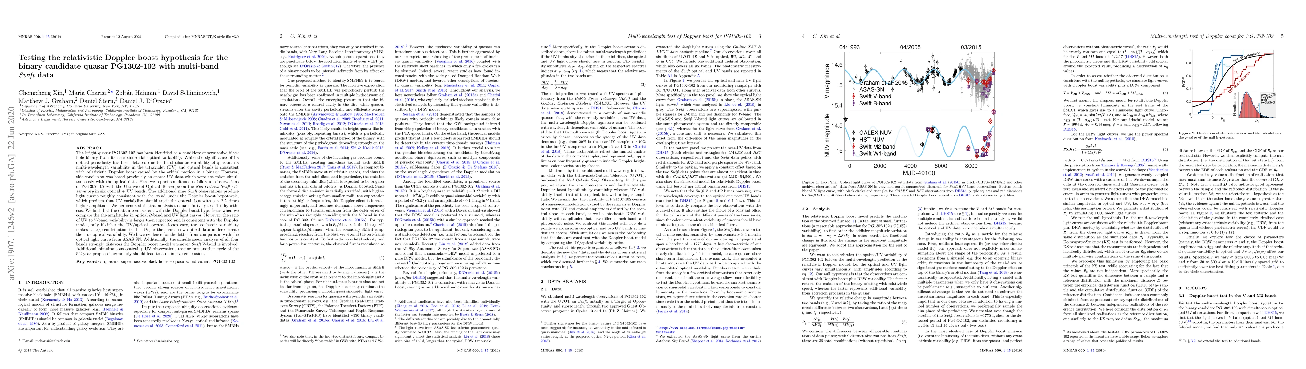 This paper tests the relativistic Doppler boost hypothesis for the quasar PG1302-102, using new simultaneous multi-band Swift data. The results support the Doppler model for UV variability tracking optical, but discrepancies arise when comparing UV to V-band variability, suggesting additional factors like spectral slope variations or stochastic variability may influence the findings.
