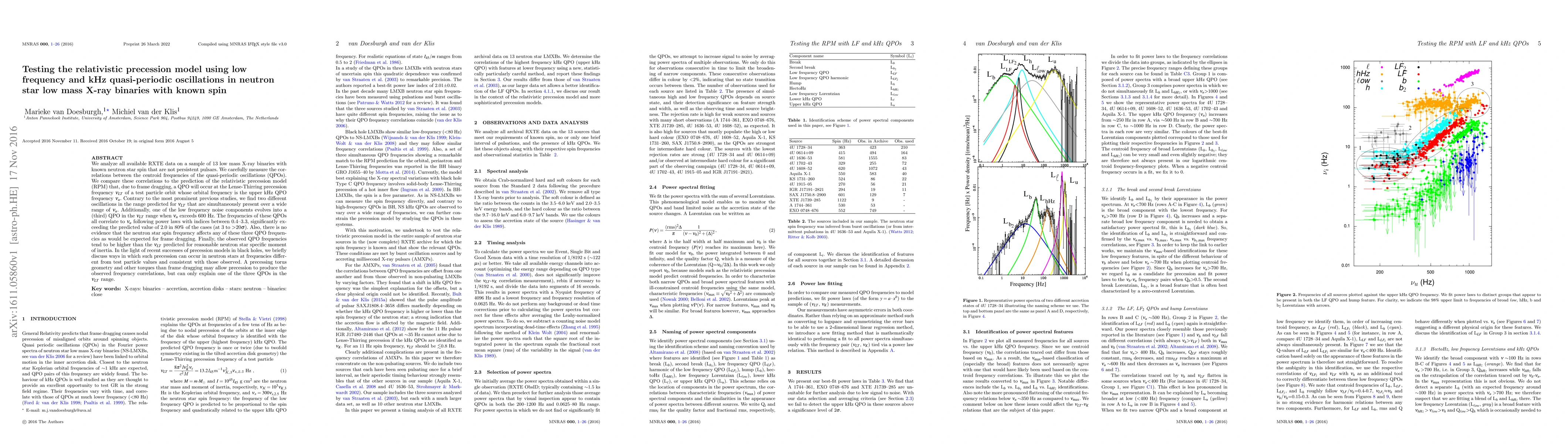 This study analyzes RXTE data from 13 neutron star low mass X-ray binaries to test the relativistic precession model, finding two QPOs in the predicted $\nu_{LT}$ range and a third evolving at higher frequencies. The observed QPO frequencies do not correlate with the neutron star spin frequency, contradicting frame dragging predictions.