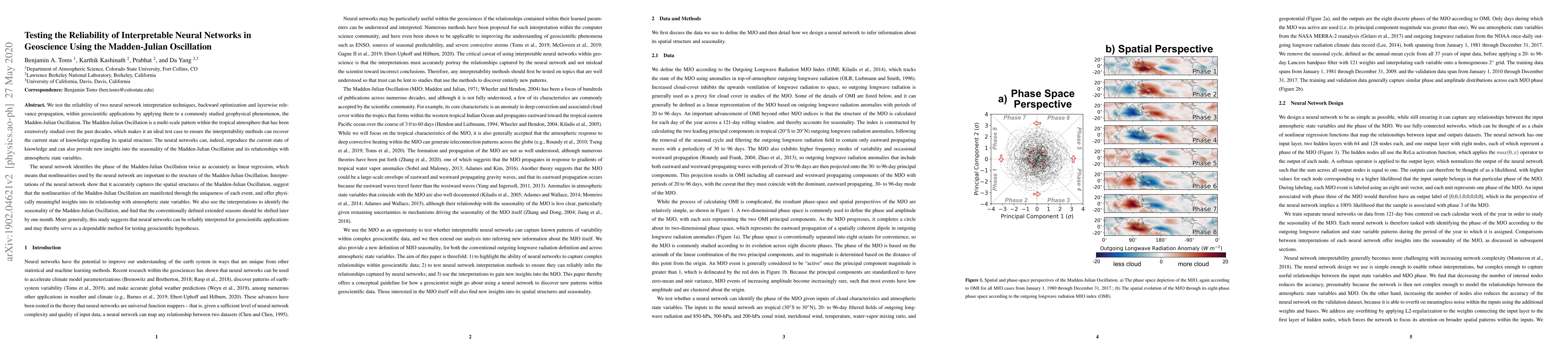 This study tests the reliability of interpretable neural networks applied to the Madden-Julian Oscillation, demonstrating their accuracy in capturing its spatial structure and seasonality. The neural networks outperform linear regression, suggesting that they can provide meaningful insights into geoscientific phenomena.