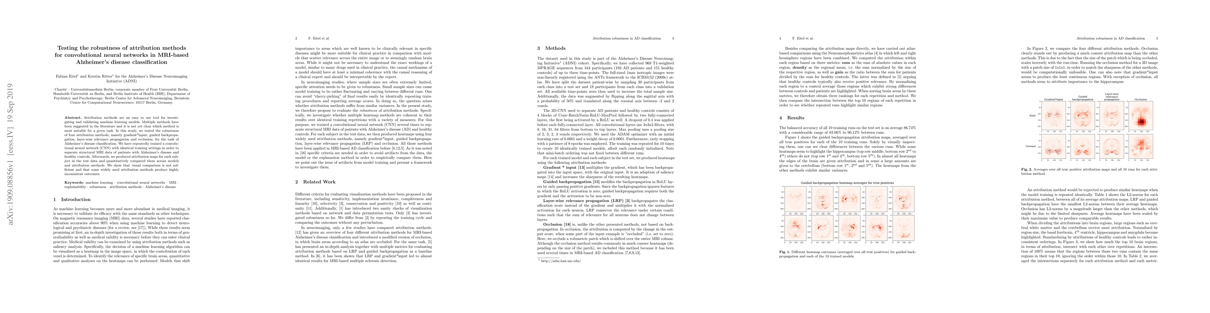 Attribution methods are an easy to use tool for investigating and validating machine learning models. Multiple methods have been suggested in the literature and it is not yet clear which method is most suitable for a given task. In this study, we tested the robustness of four attribution methods, namely gradient*input, guided backpropagation, layer-wise relevance propagation and occlusion, for the task of Alzheimer's disease classification. We have repeatedly trained a convolutional neural network (CNN) with identical training settings in order to separate structural MRI data of patients with Alzheimer's disease and healthy controls. Afterwards, we produced attribution maps for each subject in the test data and quantitatively compared them across models and attribution methods. We show that visual comparison is not sufficient and that some widely used attribution methods produce highly inconsistent outcomes.