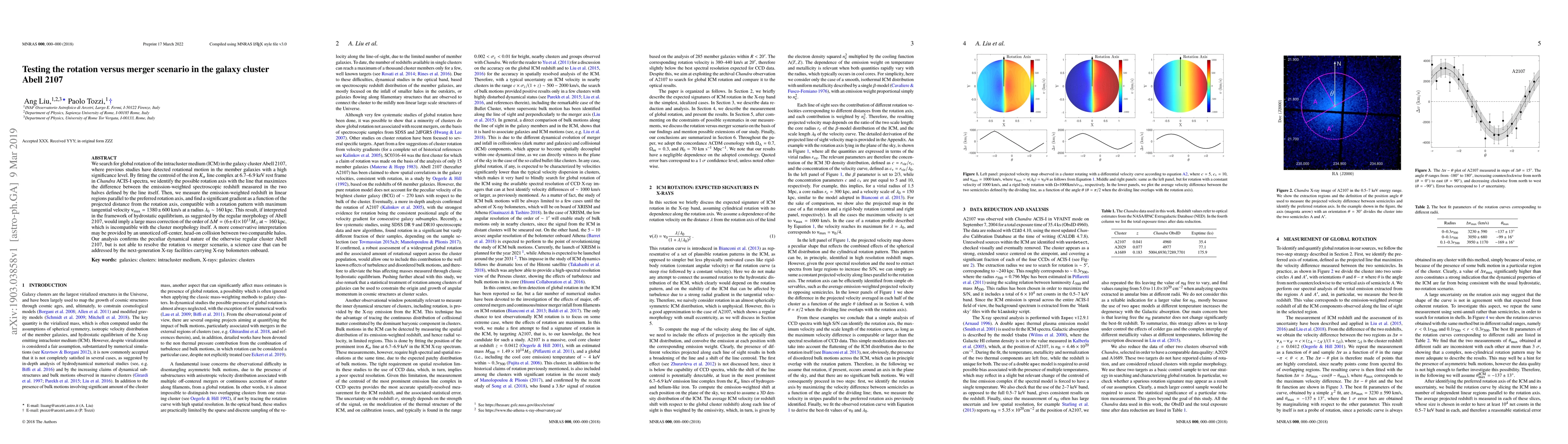 We search for global rotation of the intracluster medium (ICM) in the galaxy cluster Abell 2107, where previous studies have detected rotational motion in the member galaxies with a high significance level. By fitting the centroid of the iron $K_{\alpha}$ line complex at 6.7--6.9 keV rest frame in {\sl Chandra} ACIS-I spectra, we identify the possible rotation axis with the line that maximizes the difference between the emission-weighted spectroscopic redshift measured in the two halves defined by the line itself. Then, we measure the emission-weighted redshift in linear regions parallel to the preferred rotation axis, and find a significant gradient as a function of the projected distance from the rotation axis, compatible with a rotation pattern with maximum tangential velocity ${\tt v}_{\rm max}=1380\pm 600$ km/s at a radius $\lambda_0\sim 160$ kpc. This result, if interpreted in the framework of hydrostatic equilibrium, as suggested by the regular morphology of Abell 2107, would imply a large mass correction of the order of $\Delta M = (6 \pm 4)\times 10^{13} M_\odot$ at $\sim 160$ kpc, which is incompatible with the cluster morphology itself. A more conservative interpretation may be provided by an unnoticed off-center, head-on collision between two comparable halos. Our analysis confirms the peculiar dynamical nature of the otherwise regular cluster Abell 2107, but is not able to resolve the rotation vs merger scenario, a science case that can be addressed by the next-generation X-ray facilities carrying X-ray bolometers onboard.