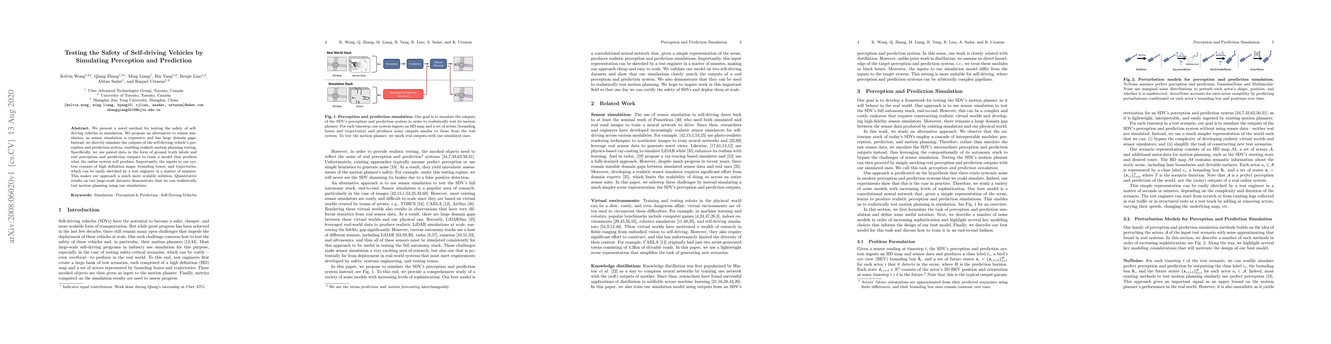 We present a novel method for testing the safety of self-driving vehicles in simulation. We propose an alternative to sensor simulation, as sensor simulation is expensive and has large domain gaps. Instead, we directly simulate the outputs of the self-driving vehicle's perception and prediction system, enabling realistic motion planning testing. Specifically, we use paired data in the form of ground truth labels and real perception and prediction outputs to train a model that predicts what the online system will produce. Importantly, the inputs to our system consists of high definition maps, bounding boxes, and trajectories, which can be easily sketched by a test engineer in a matter of minutes. This makes our approach a much more scalable solution. Quantitative results on two large-scale datasets demonstrate that we can realistically test motion planning using our simulations.