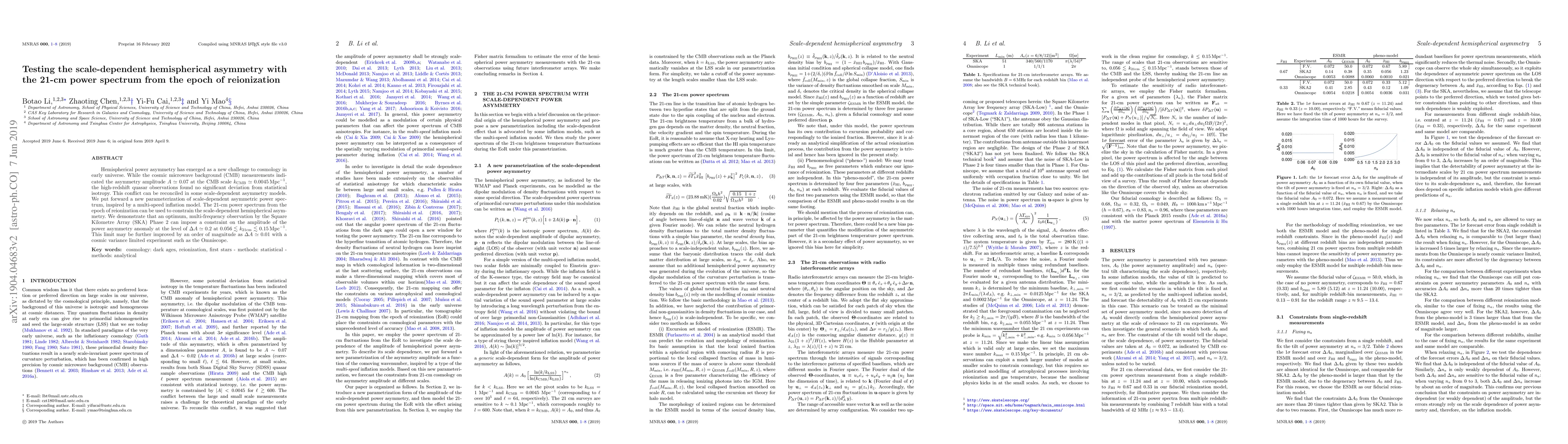 This paper proposes a new parameterization for scale-dependent hemispherical asymmetry in the early universe, suggesting that the 21-cm power spectrum from the epoch of reionization can help resolve discrepancies between CMB and quasar observations. It demonstrates that the SKA Phase 2 can constrain the asymmetry amplitude to $\Delta A \simeq 0.2$, with potential improvements to $\Delta A \simeq 0.01$ using a cosmic variance limited experiment like the Omniscope.