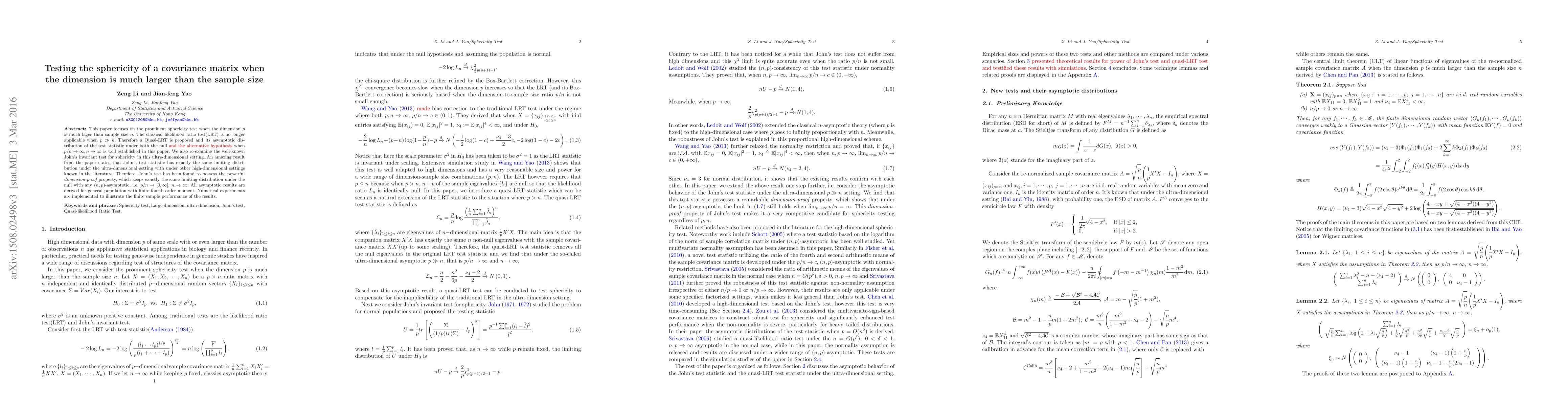 Researchers developed a new test for assessing sphericity in covariance matrices with high-dimensional data, proposing a quasi-LRT and leveraging John's test for its dimension-proof property, which maintains the same limiting distribution under the null for any asymptotic sample size and dimension ratio.