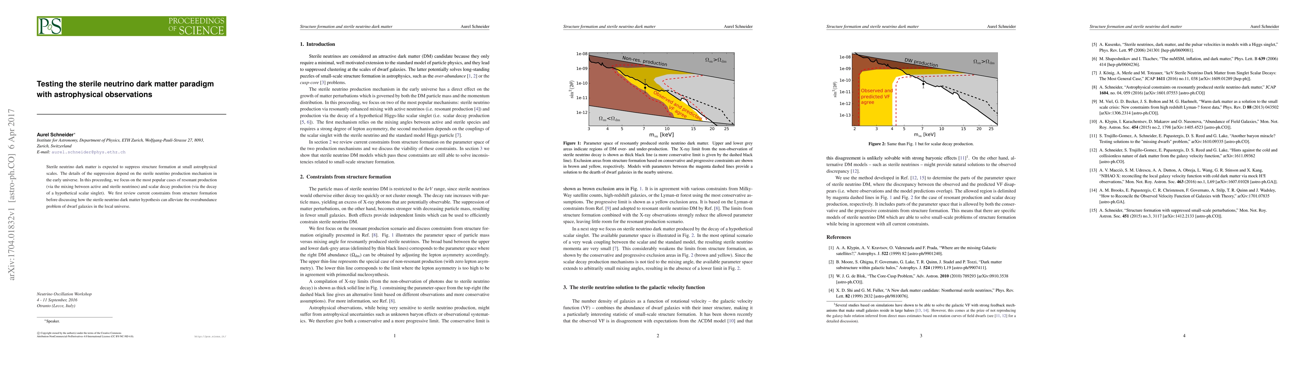 This paper examines the sterile neutrino dark matter paradigm, focusing on its impact on small-scale structure formation via resonant and scalar decay production mechanisms. It reviews existing constraints and discusses how sterile neutrino dark matter could resolve the overabundance problem of dwarf galaxies.