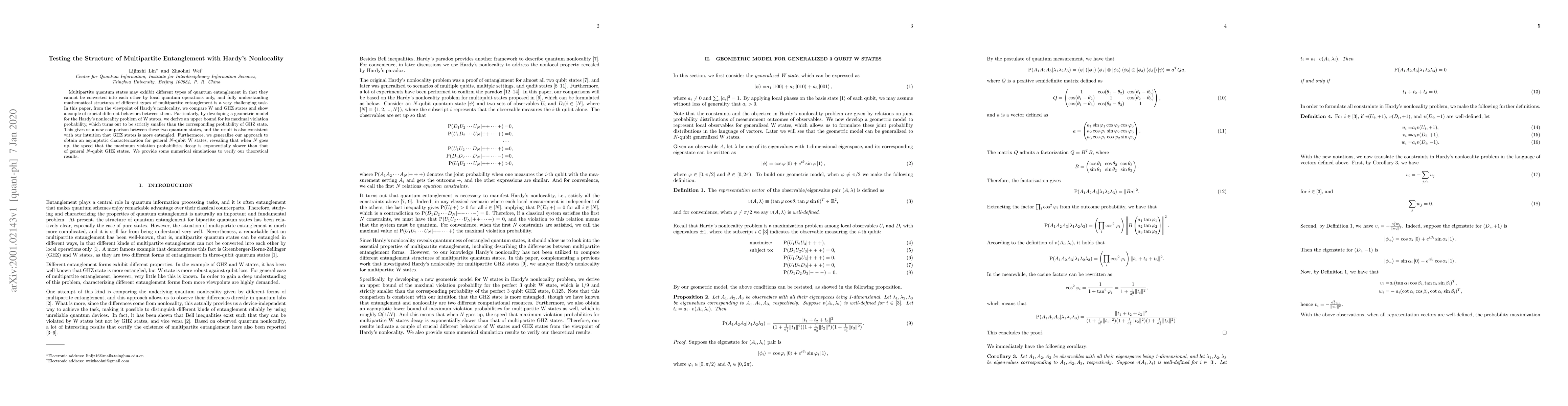 Multipartite quantum states may exhibit different types of quantum entanglement in that they cannot be converted into each other by local quantum operations only, and fully understanding mathematical structures of different types of multipartite entanglement is a very challenging task. In this paper, from the viewpoint of Hardy's nonlocality, we compare W and GHZ states and show a couple of crucial different behaviors between them. Particularly, by developing a geometric model for the Hardy's nonlocality problem of W states, we derive an upper bound for its maximal violation probability, which turns out to be strictly smaller than the corresponding probability of GHZ state. This gives us a new comparison between these two quantum states, and the result is also consistent with our intuition that GHZ states is more entangled. Furthermore, we generalize our approach to obtain an asymptotic characterization for general $N$-qubit W states, revealing that when $N$ goes up, the speed that the maximum violation probabilities decay is exponentially slower than that of general $N$-qubit GHZ states. We provide some numerical simulations to verify our theoretical results.