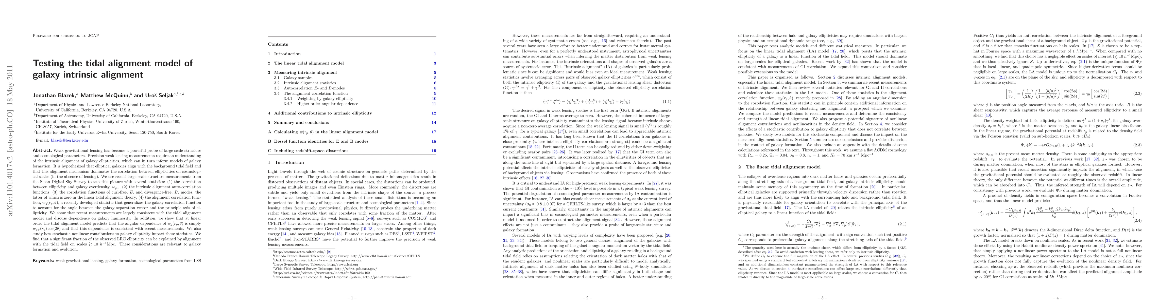 This paper tests the tidal alignment model of galaxy intrinsic alignment using large-scale structure measurements from the Sloan Digital Sky Survey. The results support the model, showing consistency with predictions on galaxy ellipticity alignment with the tidal field, and highlight the impact of stochastic nonlinear contributions on observed ellipticity.