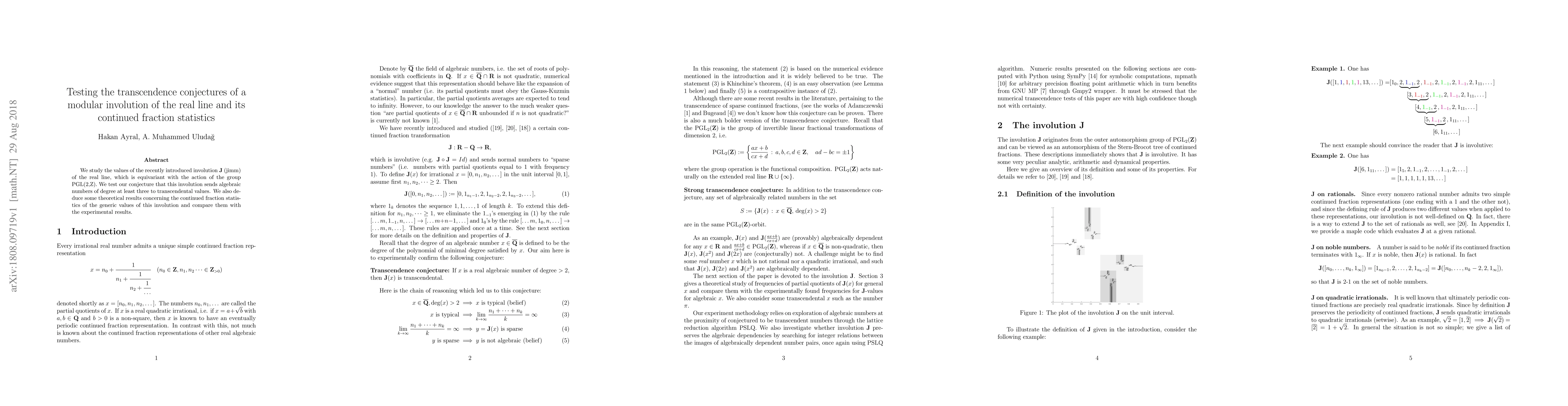 We study the values of the recently introduced involution J (jimm) of the real line, which is equivariant with the action of the group PGL(2,Z). We test our conjecture that this involution sends algebraic numbers of degree at least three to transcendental values. We also deduce some theoretical results concerning the continued fraction statistics of the generic values of this involution and compare them with the experimental results.