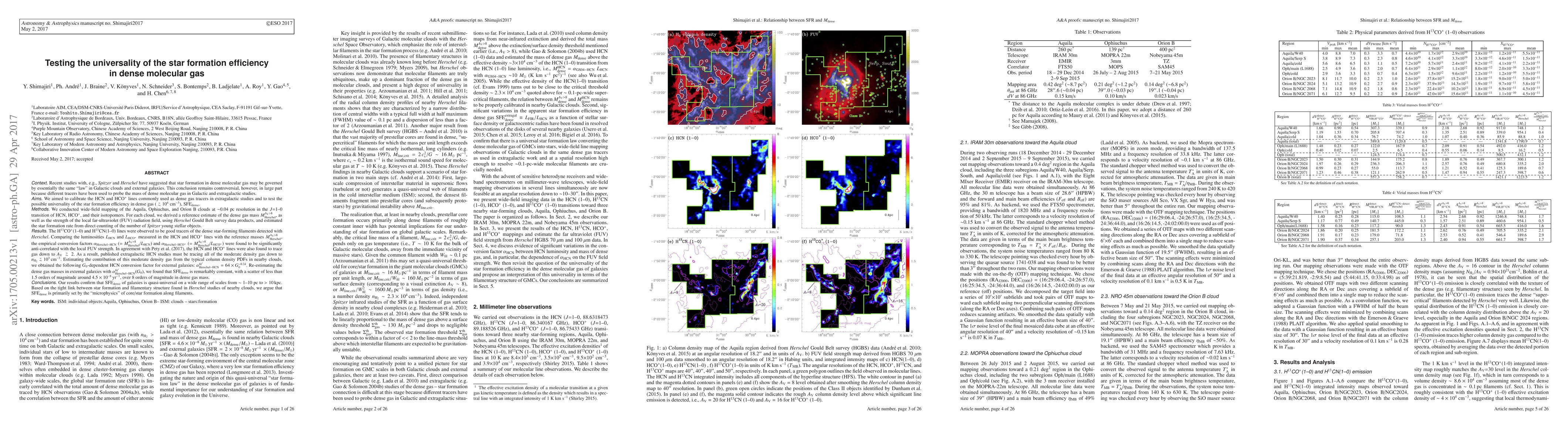 Recent studies have suggested that star formation (SF) in dense gas may be governed by essentially the same law in Galactic clouds and external galaxies. This conclusion remains controversial, however, because different tracers have been used to probe the dense gas mass in Galactic and extragalactic studies. We conducted observations of Aquila, Oph., and Orion B in HCN(1-0), HCO$^+$(1-0), and their isotopomers to calibrate the HCN and HCO$^+$ lines used as dense gas tracers in extragalactic studies and to test the possible universality of the star formation efficiency in dense gas, SFE$_{dense}$. H$^{13}$CO$^+$ and H$^{13}$CN were observed to be good tracers of the filaments detected with Herschel. Comparing the luminosities $L_{HCN}$ and $L_{HCO^+}$ with the reference masses $M_{Herschel}^{Av>8}$, the empirical conversion factors $\alpha_{Herschel-HCN}$ and $\alpha_{Herschel-HCO^+}$ were found to be anti-correlated with the local FUV strength. In agreement with Pety et al. (2017), HCN and HCO$^+$ were also found to trace gas down to Av>2. As a result, published extragalactic HCN studies must be tracing all of the moderate density gas. Estimating the contribution of this moderate density gas from the typical column density PDFs in nearby clouds, we obtained the following $G_0$-dependent HCN conversion factor for external galaxies:$\alpha_{Herschel-HCN}^{fit'}=64\times G_0^{-0.34}$. Re-estimating the dense gas masses in external galaxies with $\alpha_{Herschel-HCN}^{fit'}$, we found that SFE$_{dense}$ is remarkably constant over 8 orders of magnitude in dense gas mass. Our results confirm that SFE$_{dense}$ of galaxies is quasi-universal on a wide range of scales from ~1-10pc to >10kpc. Based on the tight link between SF and filamentary structure found in Herschel studies of nearby clouds, we argue that SFE$_{dense}$ is primarily set by the microphysics of SF in filaments.