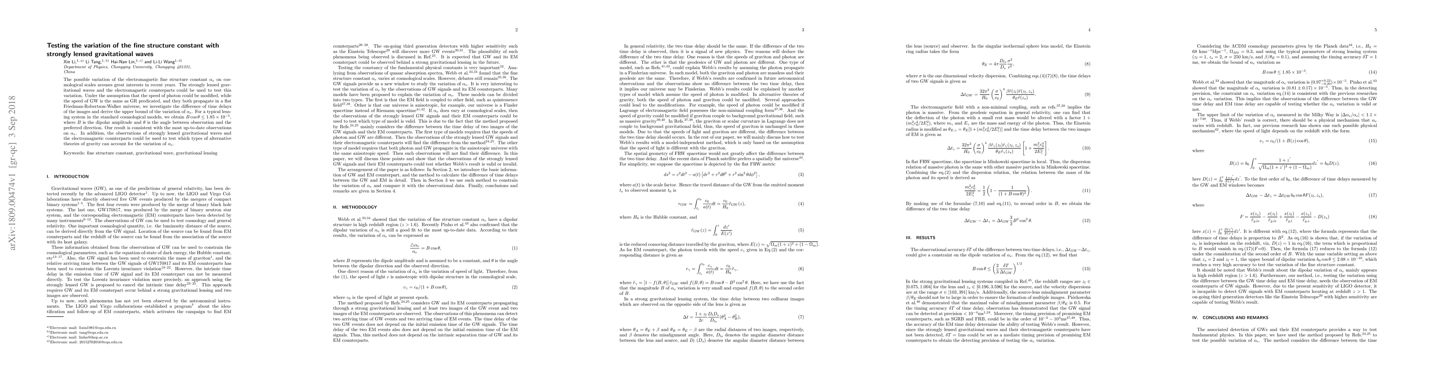 This paper investigates the potential variation of the electromagnetic fine structure constant $\alpha_e$ using strongly lensed gravitational waves and electromagnetic counterparts. The study finds an upper bound of $B\cos\theta\leq 1.85\times10^{-5}$ for the dipolar amplitude, consistent with current observations, and suggests that these observations could also test alternative theories of gravity.