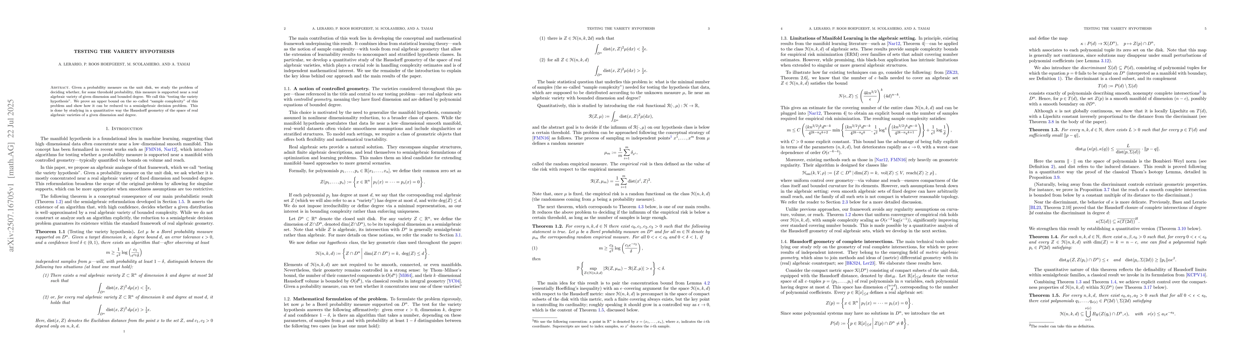 The research employs a probabilistic approach to study the problem of deciding whether a given probability measure on the unit disk is supported near a real algebraic variety of specified dimension and bounded degree, referred to as 'testing the variety hypothesis'. It proves an upper bound on the sample complexity of this problem and reduces it to a semialgebraic decision problem by analyzing the Hausdorff geometry of the space of real algebraic varieties of a given dimension and degree.