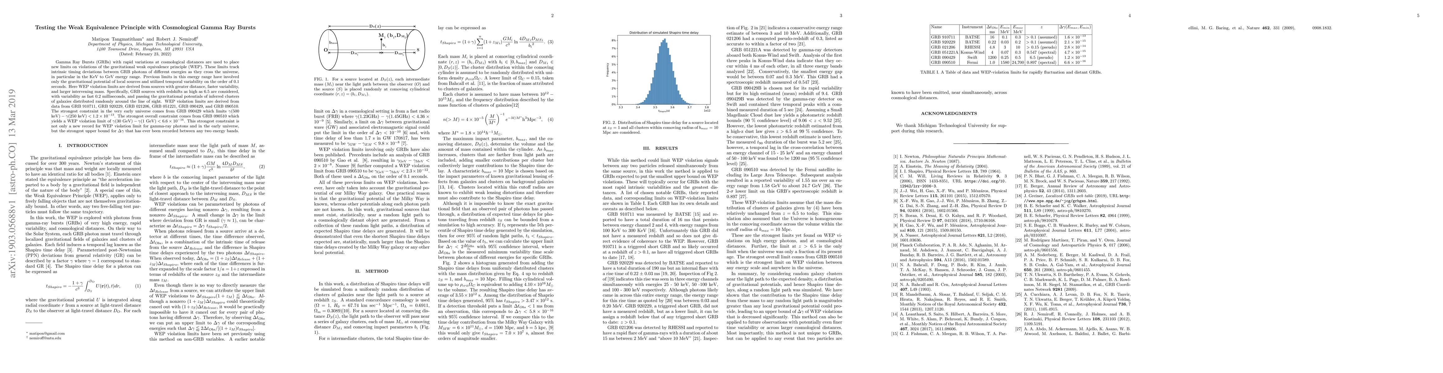 This paper tests the weak equivalence principle (WEP) using gamma-ray bursts (GRBs) at cosmological distances, deriving new limits on WEP violations by tracking timing deviations between photons of different energies. The strongest overall constraint comes from GRB 090510, setting a record WEP violation limit of $\gamma(30$ GeV$) - \gamma (1$ GeV$) < 6.6\times10^{-16}$.