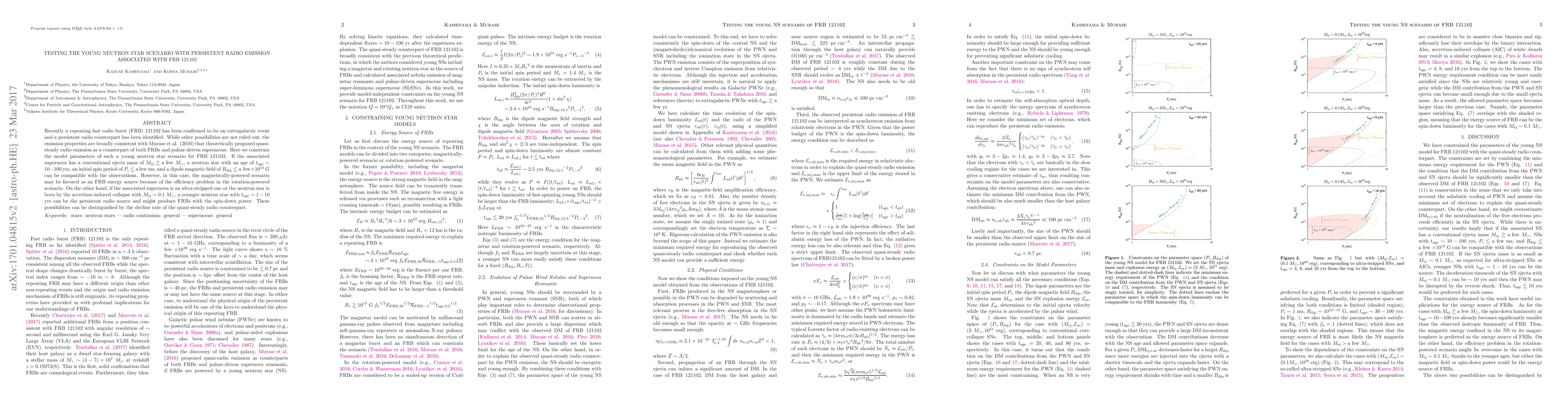 This paper investigates the young neutron star scenario for the persistent radio emission associated with the repeating FRB 121102. It finds that a neutron star with specific age, spin period, and magnetic field properties could explain the observed radio emission, though the magnetically-powered scenario may be more efficient for FRB energy.