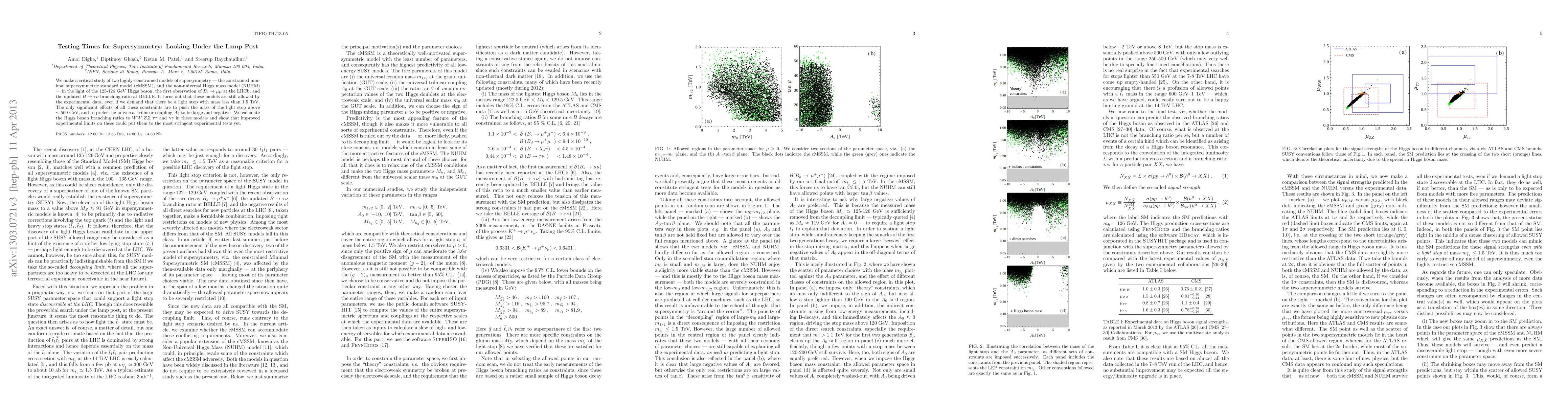 We make a critical study of two highly-constrained models of supersymmetry --- the constrained minimal supersymmetric standard model (cMSSM), and the non-universal Higgs mass model (NUHM) --- in the light of the 125-126 GeV Higgs boson, the first observation of $B_s \to \mu\mu$ at the LHCb, and the updated $B \to \tau \nu$ branching ratio at BELLE. It turns out that these models are still allowed by the experimental data, even if we demand that there be a light stop with mass less than 1.5 TeV. The only significant effects of all these constraints are to push the mass of the light stop above $\sim 500$ GeV, and to prefer the universal trilinear coupling $A_0$ to be large and negative. We calculate the Higgs boson branching ratios to $WW, ZZ, \tau\tau$ and $\gamma\gamma$ in these models and show that improved experimental limits on these could put them to the most stringent experimental tests yet.